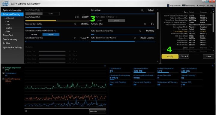 Po zainstalowaniu programu i jego uruchomieniu należy w menu po lewej [1] wybrać zakładkę Advanced Tuning. Wartość, która nas interesuje to Core Voltage Offset [2] wraz ze znajdującym się pod nim suwakiem. Wskaźnik cyfrowy po jego drugiej stronie powinien pokazywać domyślną wartość 0,000 V [3]. Po najechaniu na wskaźnik kursorem ukażą się nam strzałki [3] po jego obu stronach, a których kliknięcie zmieni wyświetlaną wartość (kroki o -/+0,005V). Jako, że interesuje nas wyłącznie obniżenie napięcia, klikamy na lewą strzałkę. Prawidłowo wykonana procedura undervoltingu powinna się składać z kilku - kilkunastu sesji, w trakcie których napięcie jest jednorazowo obniżane o max -0,010V (czytaj – dwa kliknięcia na lewą strzałkę). Jedynie przy pierwszym podejściu można się pokusić o większe zejść (ok. -0,040V) celem przyspieszenia całego procesu. Po tej czynności klikamy pomarańczowy przycisk Apply po drugiej stronie interfejsu programu [4]. Pierwsza część sesji zakończona.