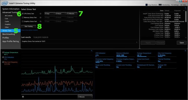 Teraz przechodzimy do drugiej części, w trakcie której będziemy testować nowy poziom napięcia. Możemy to zrobić za pomocą wbudowanego w Intel XTU narzędzia, które znajdziemy w lewym menu pod zakładką Stress Test [5]. Na nowej stronie musimy zaznaczyć pozycję CPU Stress Test [6] i określić czas trwania procesu [7] – nie powinien być on krótszy niż 15 minut. Klikamy przycisk Start testing [8]. Warto również wykonać jeden dłuższy (np. 1 godzina) test przed przystąpieniem do procesu obniżania napięcia. Pozwoli nam to na określenie, jakie wartości temperatur i częstotliwość osiąga nasz procesor pod dużym obciążeniem na fabrycznych nastawach i jaki postęp osiągnęliśmy wykonując undervolting. Będziemy się mogli również przekonać, czy i w jakim stopniu występuje u nas zjawisko throttlingu termicznego, powodującego obniżenie częstotliwości pracy procesora.