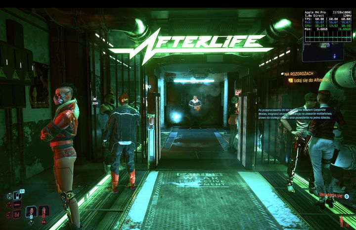 Po załadowaniu zapisu z PS5 (tak, Cyberpunk 2077 wspiera cross-save i działa to bez zarzutu) moim oczom ukazało się 60 fps i mogę powiedzieć Wam, że szczęka mi opadła. Pojeździłem trochę po mieście, postrzelałem, zaliczyłem dwie misje poboczne i 60 fps widziałem przez większość czasu. To wszystko w wysokich ustawieniach graficznych, bez ray tracingu, w rozdzielczości 1080p, która w mojej opinii jest wystarczająca przy 16-calowym ekranie. Generalnie przez dwie godziny rozgrywki licznik klatek na sekundę pokazywał bardzo stabilne 60 fps, czasami spadające do około 55 fps, czyli w sumie na poziomie konsol obecnej generacji. Słowo „konsolowe” dobrze oddaje moje wrażenia z rozgrywki na Macu – Cyberpunk 2077 po prostu działał i nie musiałem nic z nim robić (w przeciwieństwie do najnowszego „Asasyna”, w przypadku którego przez godzinę szukałem odpowiednich ustawień).