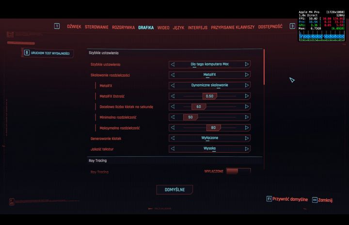Po uruchomieniu Cyberpunka 2077 od razu skierowałem się do menu opcji. Poza tym, że wygląda niemal identycznie jak pecetowe, znajduje się tam specjalny preset graficzny nazwany „Dla tego komputera Mac”. Zostaje on włączony domyślnie po pierwszym odpaleniu gry i jego zadaniem jest wykrycie posiadanej przez nas konfiguracji sprzętowej oraz dostosowanie ustawień graficznych i upscalingu do możliwości danego urządzenia. W moim przypadku były to w zasadzie same wysokie ustawienia i upscaling AI firmy Apple – MetalFX (odpowiednik DLSS Nvidii) – w trybie dynamicznym. Gra celowała też w 60 klatek na sekundę. Jak to się miało do zasadniczej rozgrywki? Bardzo dobrze.
