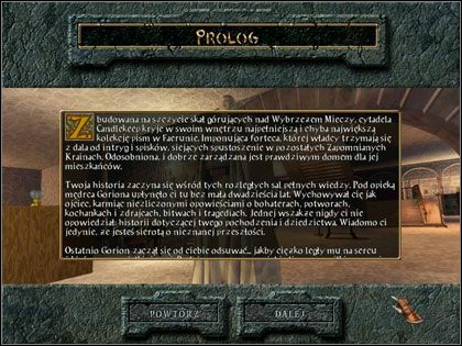 Przyjrzyjmy się teraz samej grze. Baldur’s Gate przenosi nas do miasteczka Candlekeep, położonego we wschodniej części Zapomnianych Krain, na południe od tytułowych Wrót Baldura. To właśnie w tej niewielkiej, nadmorskiej miejscowości mieszka główny bohater gry, nad którym – po obejrzeniu krótkiej introdukcji – obejmujemy kontrolę. Choć ów dwudziestoletni młodzieniec (program pozwala stworzyć reprezentanta dowolnej płci i rasy, ale na potrzeby tego tekstu przyjmijmy, że jest to mężczyzna) jest tak naprawdę sierotą, to jednak na brak miłości nie może narzekać. Od najmłodszych lat nad chłopcem ojcowską opiekę roztacza mędrzec Gorion, który oprócz naszego śmiałka przygarnął również młodą dziewczynę Imoen.