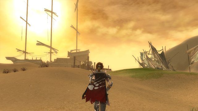 Trochę wstyd się przyznać, ale Guild Wars zainteresowało mnie przede wszystkim oprawą wizualną. W krótkiej becie trudno było poznać czy wręcz zrozumieć inne aspekty gry – w końcu wiele z nich różniło się znacząco od panujących standardów. Zniszczony Askalon, kultowa lokacja, w której rozpoczynamy rozgrywkę po krótkim wstępie, wgniatała w fotel impresjonistyczną kolorystyką i wykonaniem. Wyglądało to trochę tak, jakby ktoś uchwycił moment upadku wielkiej cywilizacji i zalał go bursztynowo-szkarłatnym sosem surrealizmu.