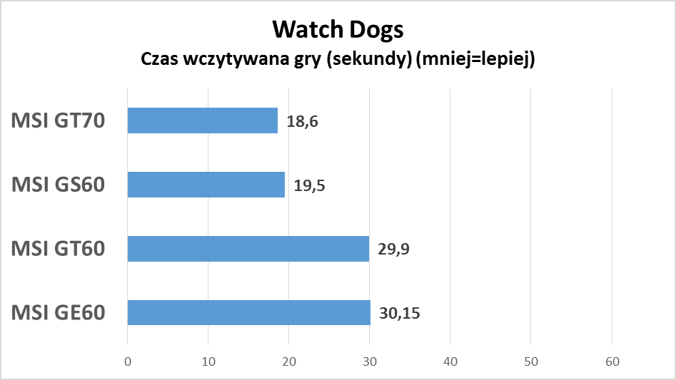 Od razu widać, w których notebookach zamontowano system Super RAID i szybkie nośniki SSD, a w których zdecydowano się na zwykłe dyski talerzowe. MSI GT70 oraz GS60 brylują na wykresie, podczas gdy modele GT60 i GE60 zostały nieco z tyłu. Oprócz szybszego wczytywania gier, na maszynach z Super RAID szybciej działa cały system, instalacje programów czy gier.