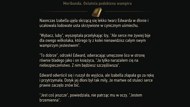W trakcie wykonywania zadania „Wiadomość dla starego przyjaciela” właściciel księgarni położonej na novigradzkim rynku pozwala bez przeszkód pomyszkować w swoim sklepiku, by gracz mógł zlokalizować tajemniczą książkę z czerwoną oprawą. Wszystkie znalezione podczas tej misji księgi są na swój sposób unikatowe, ale Waszą uwagę powinno przykuć zwłaszcza romansidło o nazwie Moribunda, którego fragment wyraźnie nawiązuje do Zmierzchu (Twilight) Stephenie Meyer. Występujący w tekście bohaterowie (Izabella i Edward) są żywcem przeniesieni z kart popularnej powieści dla nastolatek.