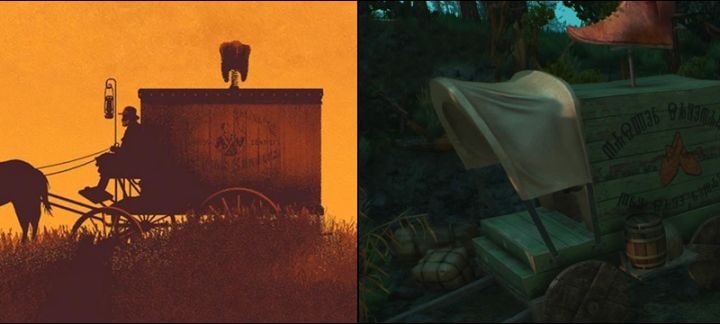 Jeszcze jeden Tarantinowski smaczek wiąże się z Talarem, a dokładnie – z jego wozem. Szykując przykrywkę dla szefa temerskiego wywiadu, studio CD Projekt RED najwyraźniej zapatrzyło się na film Django i występującą w nim postać Kinga Schultza. Wprawdzie obaj panowie udają przedstawicieli innych profesji – Talar podaje się za szewca, a Schultz za dentystę – ale obaj mają bardzo podobne środki transportu. Wystarczy zerknąć na powyższy obrazek i porównać formę napisów na burtach wozów czy umieszczone na ich dachach swoiste szyldy. Trudno mówić tu o przypadkowym podobieństwie, prawda?