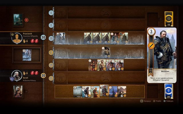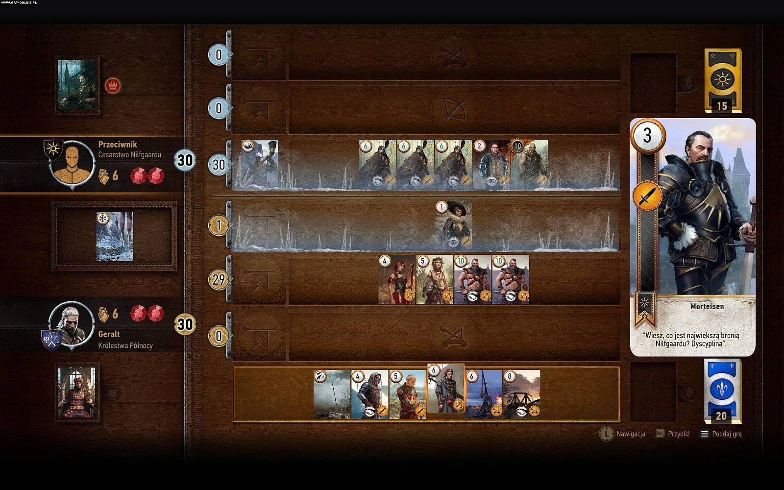 W Dzikim Gonie inaczej rozłożono akcenty. Jak już wspominałem, w grze studia CD Projekt Red na pierwszym miejscu znajduje się fabuła, więc deweloper starał się nie przesadzić z nadmiarem aktywności odrywających gracza od głównego wątku. Nie oznacza to jednak, że zadań pobocznych i innych tego typu atrakcji jest mało – wręcz przeciwnie. Różnica względem Fallouta 4 polega na tym, że owe dodatkowe misje zawsze są blisko właściwej opowieści i zgrabnie się z nią przeplatają. Poza tym Wiedźmin 3 robi użytek z typowego dla gatunku MMORPG podziału świata na strefy przeznaczone dla postaci na określonym poziomie – w ten sposób gracz raczej nie pogalopuje w siną dal tuż po rozpoczęciu zabawy, bo jeśli zapuści się za daleko, to byle bandyta rozpłata mu czaszkę jednym machnięciem siekierki. I choć rozwiązanie takie jest bardziej sztuczne niż falloutowe skalowanie poziomów przeciwników, to nie sposób odmówić mu skuteczności. A jakim to licznym aktywnościom nieobowiązkowym mogą oddać się gracze? Na pierwszy plan wysuwają się wiedźmińskie zlecenia i inne pomniejsze wyzwania. Dominujący składnik często stanowi w nich walka i eksploracja rozmaitych lokacji (np. w poszukiwaniu unikatowych przedmiotów), ale na porządku dziennym jest też konwersacja i podejmowanie wyborów, które prowadzą do odmiennych finałów zadań. Gdy się to komuś znudzi, może spróbować swoich sił w takich konkurencjach jak walka na pięści, wyścigi konne czy karciany gwint. Ten ostatni zasługuje na szczególne wyróżnienie, bo stanowi niejako grę w grze – niezbyt złożoną, ale oferującą mnóstwo zabawy i mającą duży potencjał.