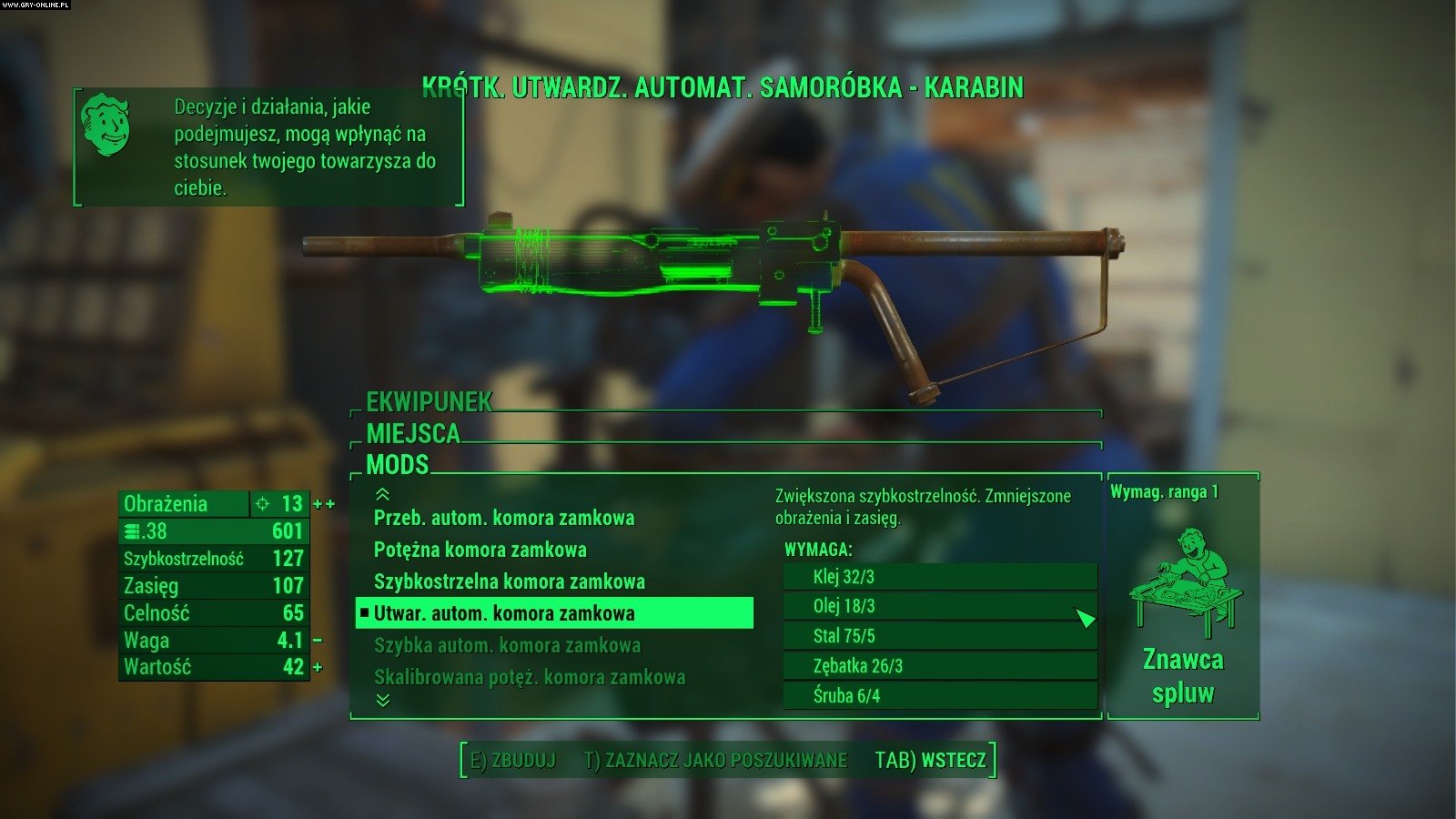 Inaczej jest w grze Bethesdy. Wprawdzie skupiamy się tu raczej na modyfikowaniu gotowych przedmiotów niż tworzeniu ich od podstaw, ale wpływ tych przeróbek jest znacznie bardziej odczuwalny. Choćby broń – redukcja odrzutu, powiększenie magazynka czy dodanie lunety snajperskiej to zmiany, które odciskają wyraźne piętno na sposobie prowadzenia walki z użyciem danego środka zagłady. Jeszcze ciekawiej robi się, gdy weźmiemy na warsztat pancerz wspomagany i zamontujemy w nim np. jetpack. Zresztą arsenał broniłby się, nawet gdyby zabrakło możliwości jego przerabiania. Pod względem różnorodność oręża Fallout 4 może zawstydzić niejeden rasowy shooter, a frajda z posługiwania się takimi zabawkami jak śmieciomiot (potężna wyrzutnia, która strzela dowolnym złomem, jaki akurat mamy pod ręką) jest wręcz nie do opisania. Zresztą dotyczy to nie tylko broni. Crafting gwarantuje istnienie tylu wariantów pukawek i pancerzy, że Fallout 4 powinien zaspokoić potrzeby większości entuzjastów zbieractwa. Poza tym Bethesdzie należy się pochwała za to, że w końcu (po kilkunastu latach oferowania tej opcji w swoich grach) nadała sens zbieraniu takich śmieci jak wiaderka, talerze i miotły – uczynienie z nich składników rzemieślniczych było strzałem w dziesiątkę, w dodatku świetnie wpisało się w klimat postapokaliptycznego robienia „wszystkiego z niczego”.