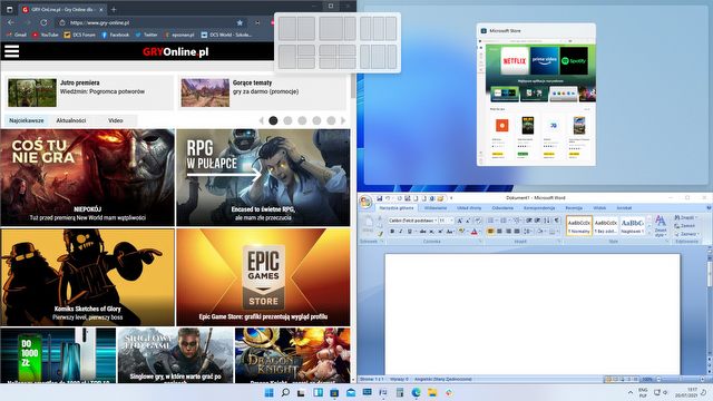 Udogodnieniem jest również funkcja „Snap Layouts”, czyli szybki wybór rozkładu kilku okien na pulpicie. Z pewnością docenią ją posiadacze dużych lub kilku monitorów, na których zmieszczą się na czytelnym obszarze roboczym więcej niż dwa okna. Dla mnie wciąż szybsze jest użycie skrótu klawisza Win ze strzałkami, ale przy małym monitorze nigdy nie wykorzystuję innego podziału niż na prawą i lewą stronę ekranu. Małą wadą jak na razie jest brak skrótów klawiaturowych dla „Snap Layouts”, ale być może pojawią się one w kolejnych aktualizacjach. Warto zaznaczyć, że czegoś takiego ciągle brakuje w systemie macOS i trzeba się tam posiłkować zewnętrzną aplikacją.