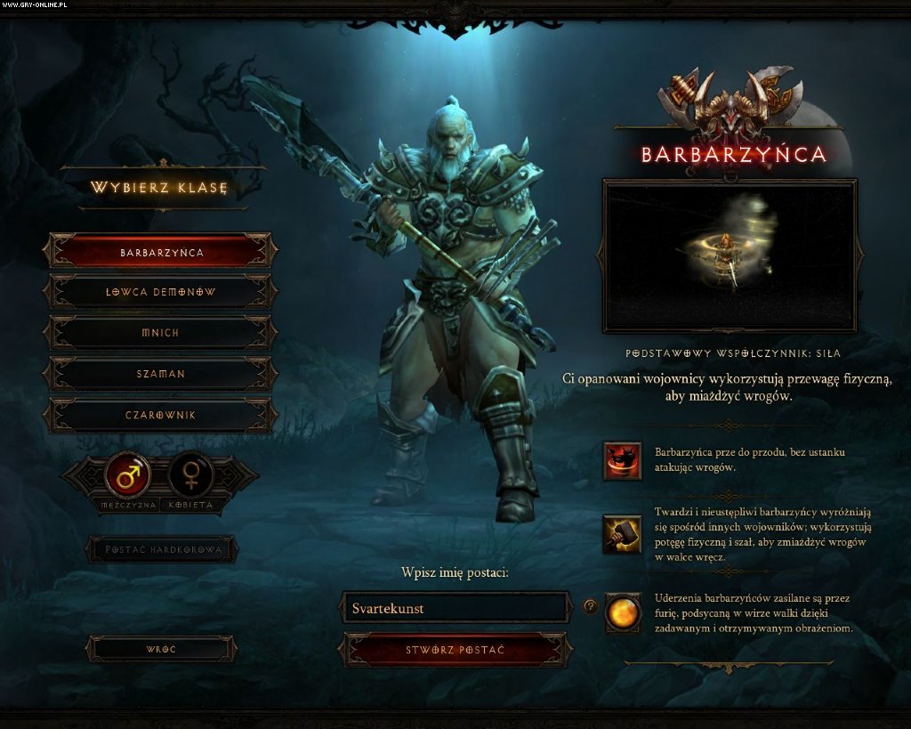 BARBARZYŃCA (33%) – Wybór graczy preferujących klasyczny oręż. Już wersja beta udowodniła, że żaden z bohaterów nie sieje takiego spustoszenia jak właśnie barbarzyńca. Odlatujący w wyniku uderzeń wrogowie, posoka tryskająca na wszystkie strony – kto zdecyduje się na tego mocarza, zobaczy pokaz pierwotnej siły.
