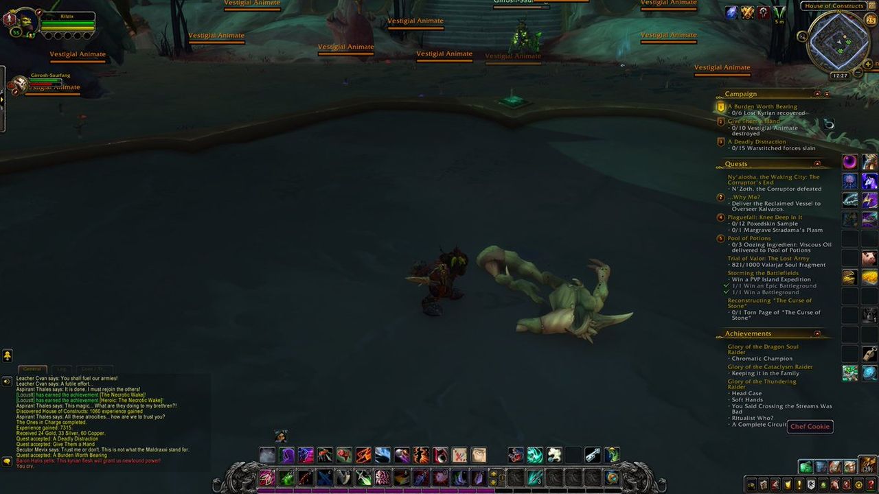 Widzisz to truchło, podróżniku? To zwłoki "Captain" Cookie, z którym pewnie walczyłeś w Deadmines. Tak, na tym statku od Defias Brotherhood. Cookie najpierw służył pod dowództwem Edwina VanCleefa, jako kuk, ale postanowił awansować i sam siebie ogłosił kapitanem. Niczego to nie zmieniło, bo dalej służył VanCleefom, tylko tym razem Vanessie, córce Edwina. Jako ciekawostkę dodam, że do tej pory nie widziałem w Shadowlands żadnego, innego murloka! Ciekawa sprawa…