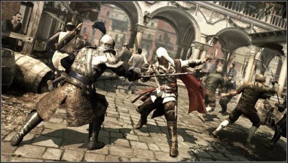- Czasem jednak nie uda się uciec, wtedy czeka nas starcie z (najczęściej) kilkoma przeciwnikami. Niezmienna pozostaje zasada – wrogowie otoczą Ezio i atakować będą pojedynczo, co sprawi, że walka na pewno nie będzie trudniejsza. Z drugiej jednak strony dodatkowe emocje zagwarantuje fakt, że będzie można zabierać broń oponentom i używać jej przeciwko nim.