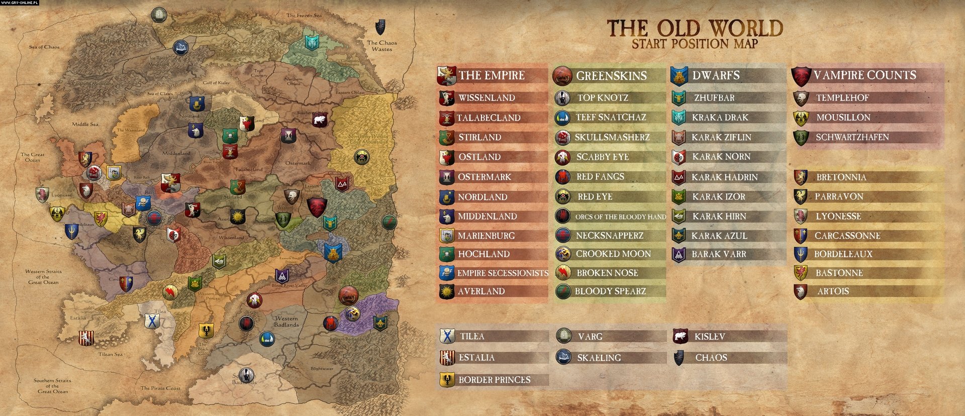 Oczywiście należy mieć na uwadze, że Stary Świat to tylko jeden z kontynentów w uniwersum Warhammera. Za oceanem na zachodzie mieści się zamieszkany przez wysokie elfy Ulthuan, a jeszcze dalej znajdują się lądy będące domem m.in. dla mrocznych elfów i jaszczuroludzi. Na południu rozciąga się natomiast piaszczysta Arabia, zaś na wschodzie, za pasmem Gór Krańca Świata, leżą ponure Mroczne Ziemie, z kolei za nimi są orientalne Królestwa Indu i Kataj. Jednak dokładniejsze opisywanie tych krain na razie nie ma sensu. Jak wiadomo, Creative Assembly zamierza stworzyć trzy gry w świecie Warhammera, każdą z odrębnym wycinkiem tego uniwersum i frakcjami właściwymi danemu regionowi. Omówimy więc te zagadnienia, gdy przyjdzie na to odpowiedni czas. Na razie przejdźmy do frakcji Starego Świata.