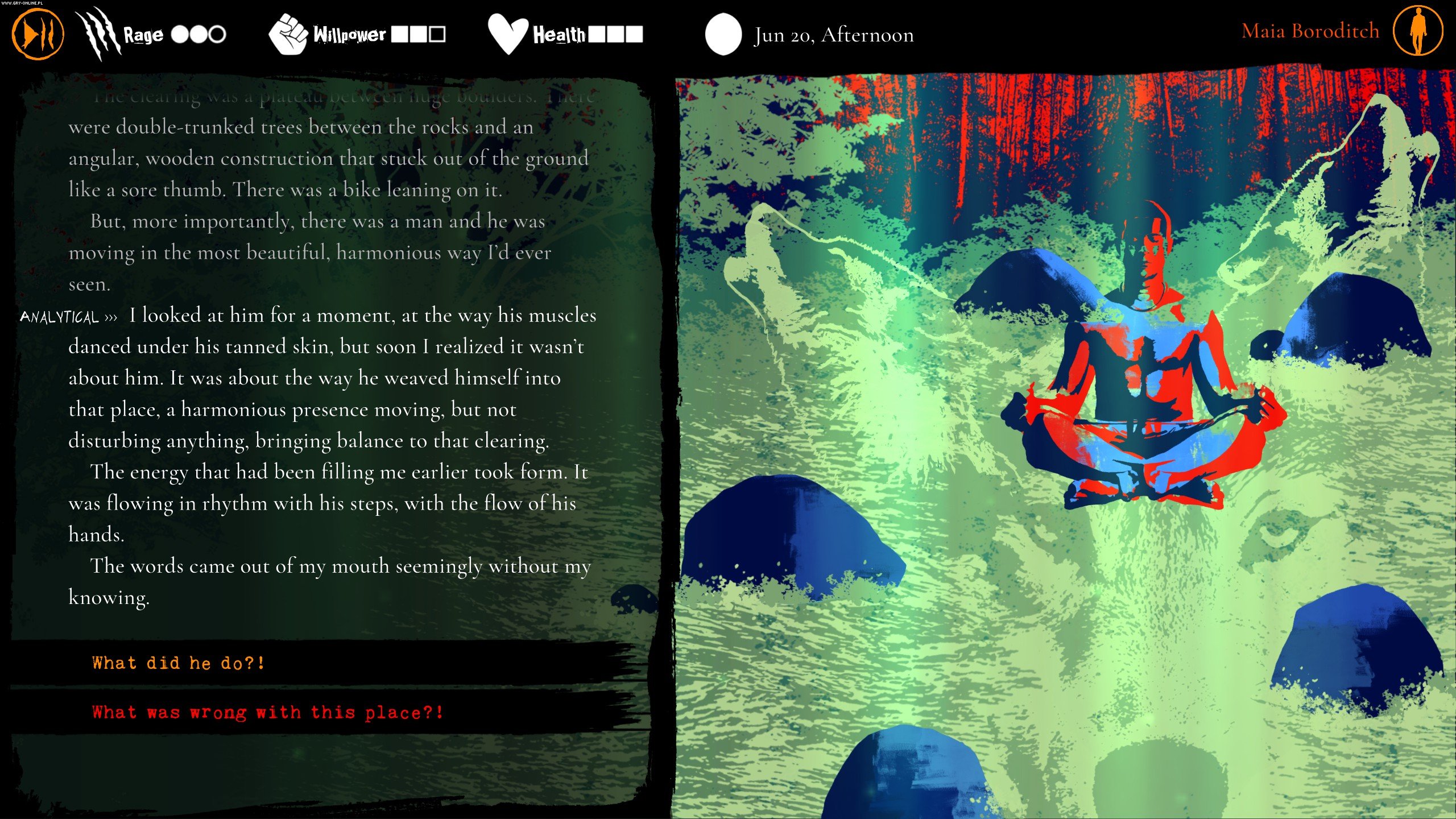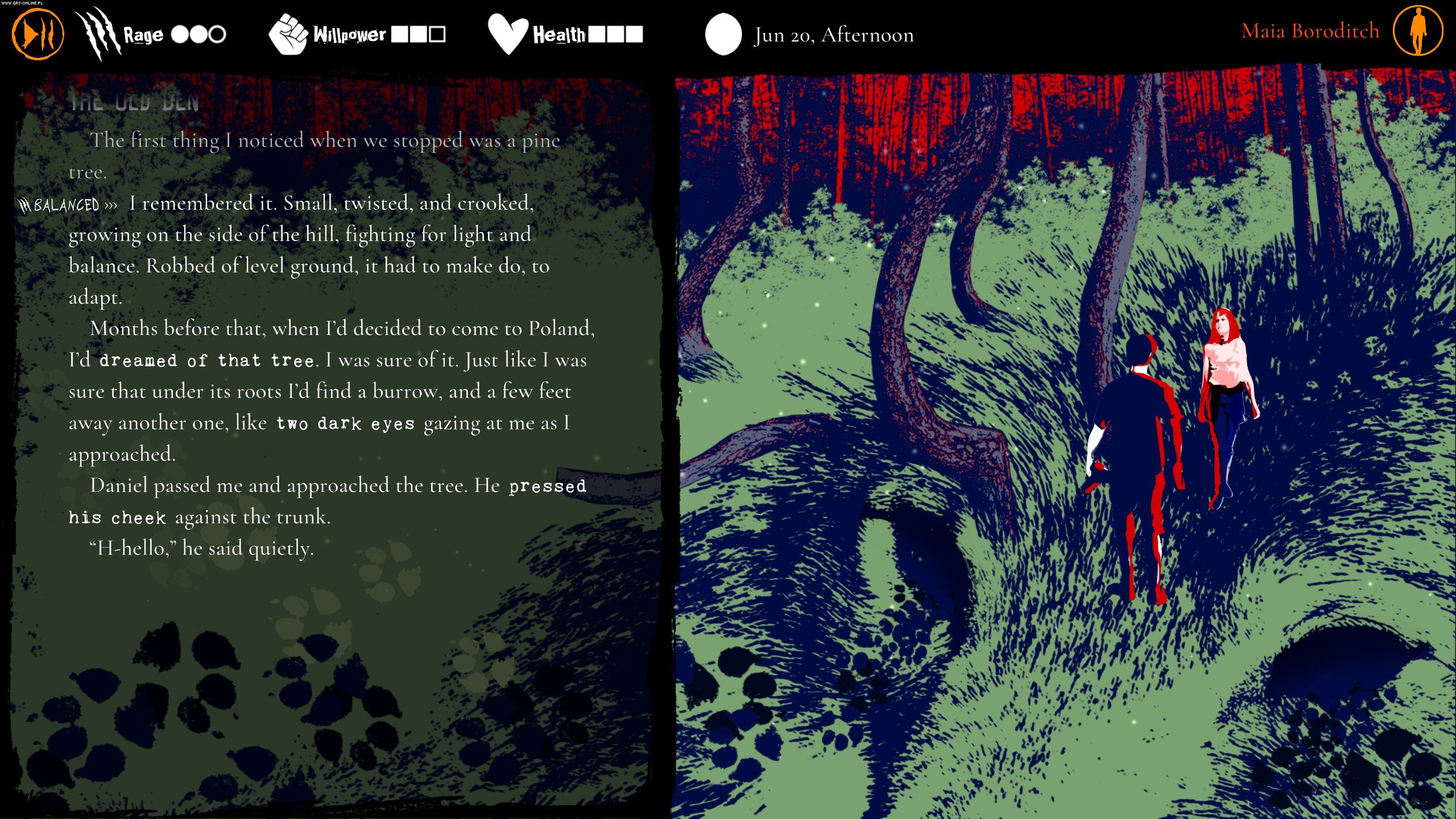Główna bohaterka wydaje się osobą, którą da się polubić od razu, a to ważne w grach, które komunikują się z nami przy pomocy tekstu. Tajemnica, do której przygotowują nas tu twórcy, ma co najmniej kilka poziomów. Po pierwsze, ciekawy jest rodowód Mai (Amerykanka, która przyjeżdża do Polski po to, by poznać swoje korzenie w polskiej wsi). Po drugie, obecność zwierzęcego by tak rzec pierwiastka w jej psychice oraz cały bagaż systemu RPG prawdopodobnie uwikła nas w wielką, duchową i krwistą kabałę.