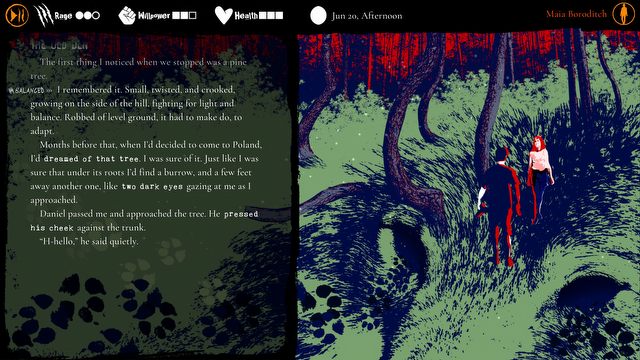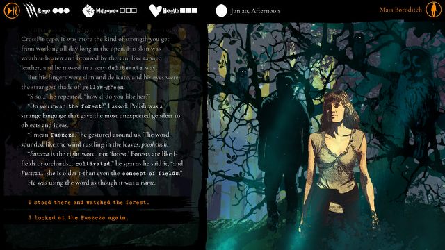 Aby nie wywołać reakcji tl;dr, Werewolf: The Apocalypse – Heart of the Forest wyświetla nam tekst kolejno, linijka po linijce, odpowiadając tempu naszego czytania. Co jakiś gra zmusza nas do podejmowania wyborów, które mają wpływ na wydarzenia w grze oraz statystyki. W tle obserwujemy ładne ilustracje, które zazwyczaj podkreślają wymowę danej sceny. Wyobraźcie więc sobie, że czytacie coś w stylu bardzo interaktywnego opowiadania, którego wynik zależeć będzie od waszych wyborów. Tym właśnie jest Heart of the Forest.