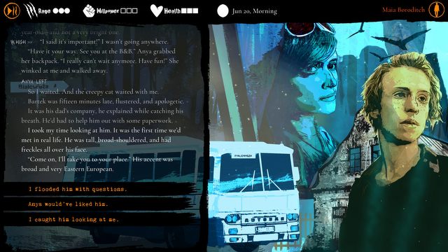 Wybory rzeczywiście wydają się mieć znaczenie – rozegrałem demo dwa razy. Za pierwszym razem w ogóle nie spotkałem postaci Bartka, ponieważ nie zdołałem przekonać swojej towarzyszki, aby na niego zaczekać. Przy drugim podejściu mojej postaci puściły nerwy, ale dzięki temu dowiedziałem się kilku nowych informacji o świecie. Wydaje się więc, że opowieść w zależności od naszych poczynań może zmierzać w innych kierunkach.