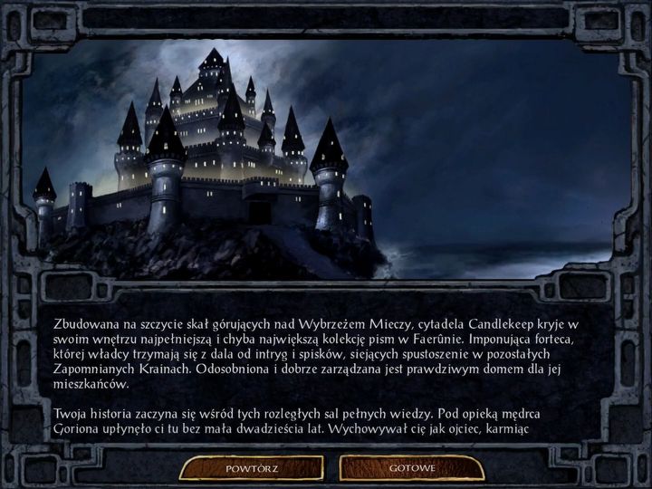 Tekst, który automatycznie słyszymy czytany głosem Piotra Fronczewskiego.Baldur's Gate: Enhanced Edition, Beamdog, 2012.
