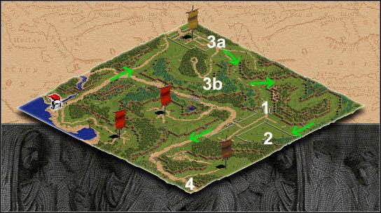 Jedna trzecia zadania już za nami. Zgarnij teraz swoje zwierzęta obierając wskazany na mapce jar jako nowy kurs. Otoczony skałami nie skręcaj w prawą odnogę, prowadzi ona do zcentralizowanego zestawu wież (1 ), tylko dłuższą drogą zejdź na sam dół krainy. Przełam ogrodzenie, potnij kłami śmiałych wartowników i uwolnij uwięzionych wieśniaków (2 ). W tym momencie możesz kontynuować marsz na drugą osadę czerwonych (jeżeli nie miałeś wcześniej dłuższych postojów, to też stosunkowo prosta do podbicia), w międzyczasie wysyłając trojkę chłopów w okolice spalonej osady żółtych lub po prostu zatrzymaj armię.
