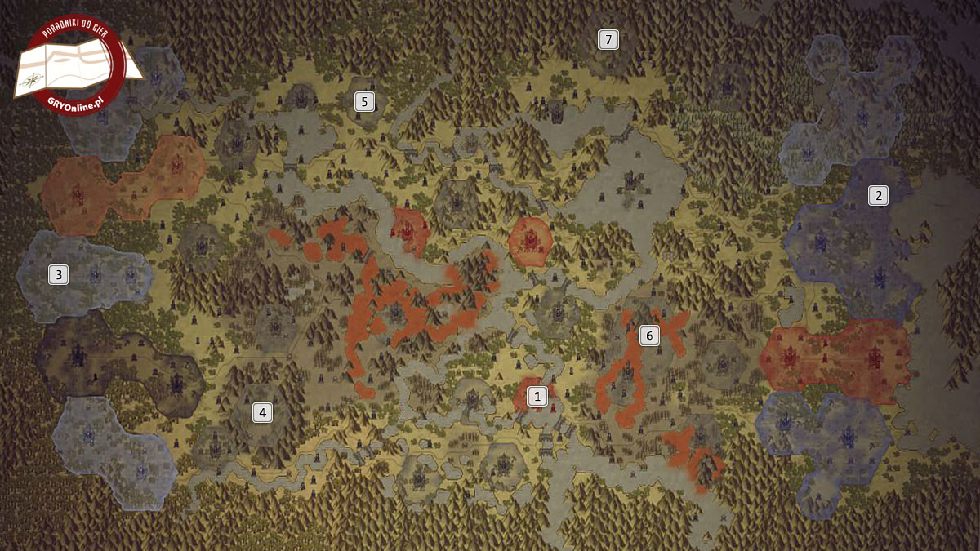 Zaczynasz w samym środku, otoczony przeciwnikami [1]. Jednego z nich znajdziesz najprawdopodobniej na wschodzie [2], a kolejnego na zachodzie [3]. Warto zauważyć, że na mapie znajdują się również aż 4 Siedliska.
