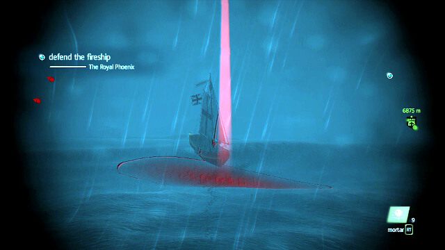 Trzymaj się relatywnie blisko statku, który musisz eskortować, ale bez przesady by w razie czego nie narażać go na ostrzał. Lada moment pokażą się wrogie jednostki. Od razu użyj moździerza by zbombardować zbliżające się łódki. Pamiętaj by celować trochę w przód. Jeden celny strzał zniszczy jeden statek, więc z wykonaniem zadania dodatkowego nie powinno być wielkich problemów.