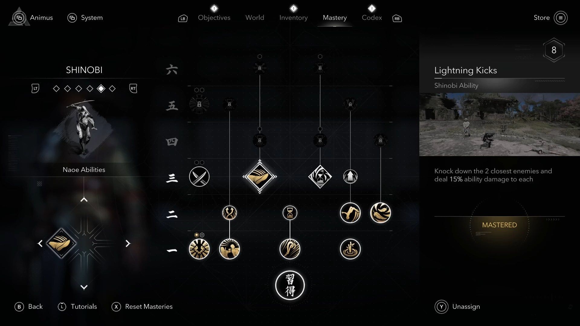 Każda postać ma sześć drzewek umiejętności dedykowanych umiejętnościom ogólnym lub konkretnej broni. Nowe umiejętności kupujecie przy pomocy punktów mistrzostwa (Mastery Points) - wszystkie drzewka korzystają z tego samego rodzaju punktów, więc musicie decydować, na które drzewko je wydać. Niektóre umiejętności kosztują także więcej punktów niż tylko jeden. Wydanie dostatecznej liczby punktów na określone drzewko zwiększa Mistrzostwo tego drzewka, co wiąże się z określonym pasywnym bonusem, np. zwiększeniem wszystkich obrażeń zadawanych przez katanę. W dowolnym momencie, za darmo, możecie także zresetować drzewko umiejętności - zwróci wam to wszystkie wydane na nie punkty. Jak to zrobić opisaliśmy na osobnej stronie poradnika.