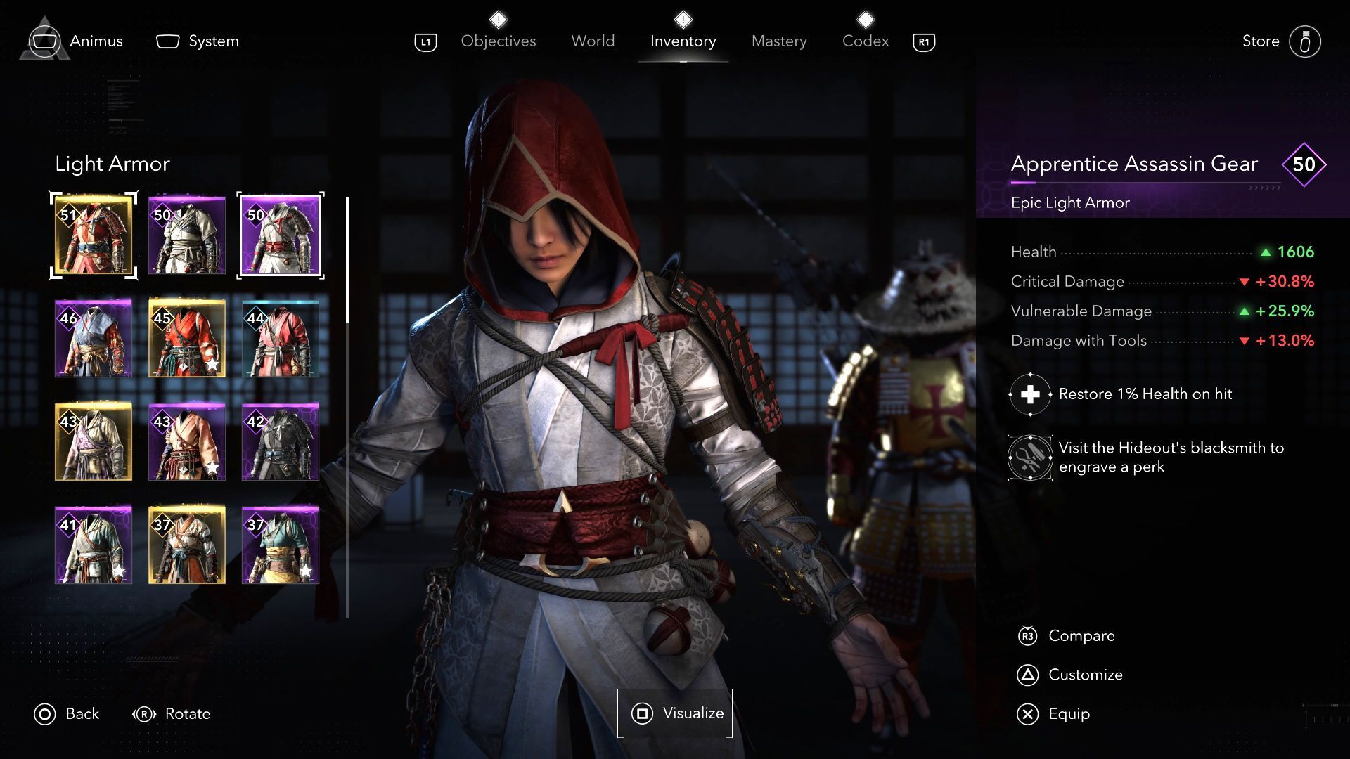Można też usprawniać odnawianie punktów zdrowia dzięki wybranym elementom wyposażenia. Zdobywany sprzęt może być opisany statystykami powiązanymi z regeneracją energii życiowej. W przykładzie z obrazka kaptur uczennicy Asasynów może odnawiać 1% zdrowia w momencie uderzenia.