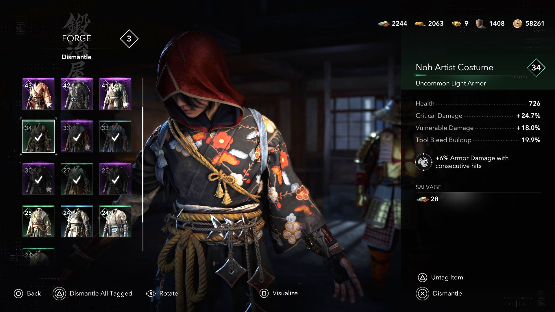 - Przejdźcie do zakładki rozbierania przedmiotów. Możecie zaznaczyć kilka niechcianych broni lub pancerzy (wciskajcie przy każdym z nich Trójkąt/Y), a następnie rozmontować je pojedynczym poleceniem (przytrzymanie tego samego przycisku). Jednorazowo uzyskacie wtedy więcej materiałów z rozebranych rzeczy.