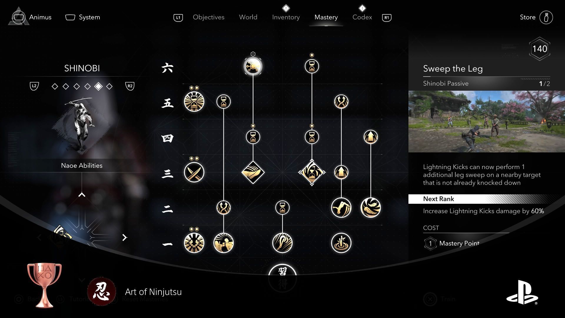 - Komentarz: Na potrzeby trofeum odblokujcie umiejętność Kopniak bojowy z drzewka Samuraj dostępnego dla Yasuke. Przypiszcie ją do jednego ze slotów na aktywne umiejętności.