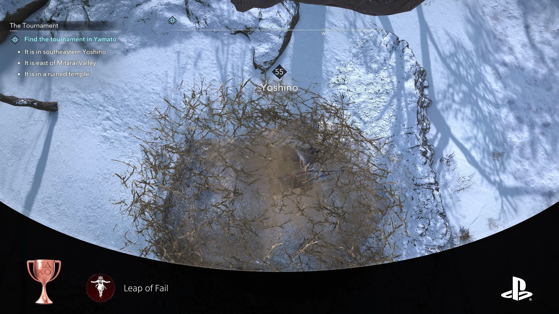 - Komentarz: To proste osiągnięcie. Użyjcie szybkiej podróży, by przenieść się Yasuke do dowolnego odkrytego punktu widokowego. Wykonajcie Yasuke skok w stronę stogu siana lub innego miejsca aktywacji skoku wiary. Jego "awaryjne lądowanie" nagrodzone zostanie trofeum.