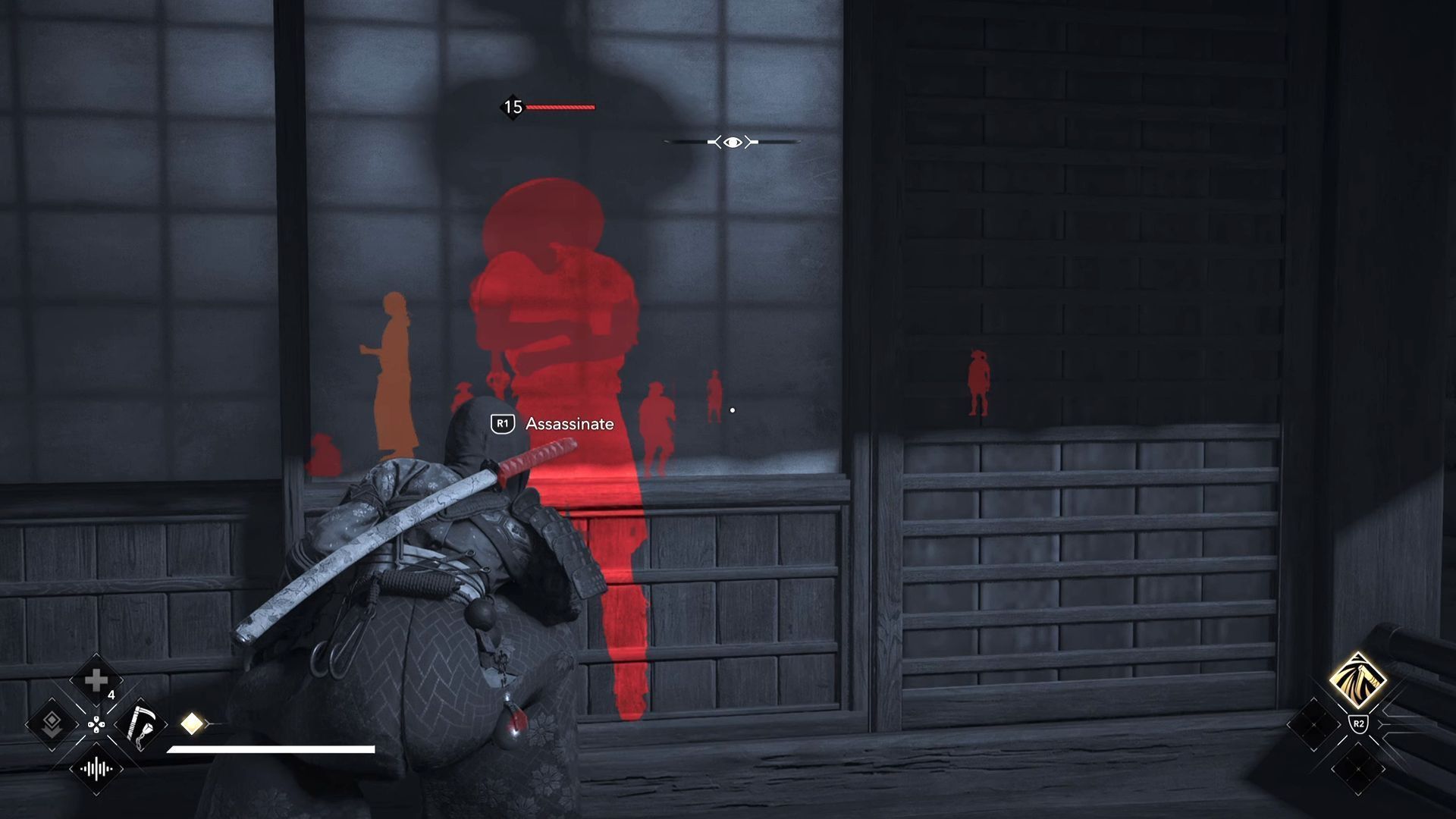 - Budynki z ekranami shoji pojawiają się m.in. we wrogich zamkach. Prześwietlajcie otoczenie i szukajcie okazji żeby zabić przeciwnika stojącego tyłem do drzwi shoji (przykład na obrazku).