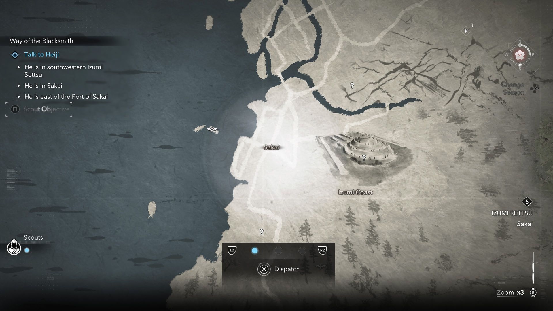 - Wybierzcie dowolny quest, w którym musicie znaleźć jakąś lokację czy postać. Na ekranie mapy możecie wysłać zwiadowców do obszaru poszukiwań (przykład na obrazku). Trofeum odblokuje się jeśli poprawnie wytypowaliście obszar i ich działania zakończą się znalezieniem celu misji.