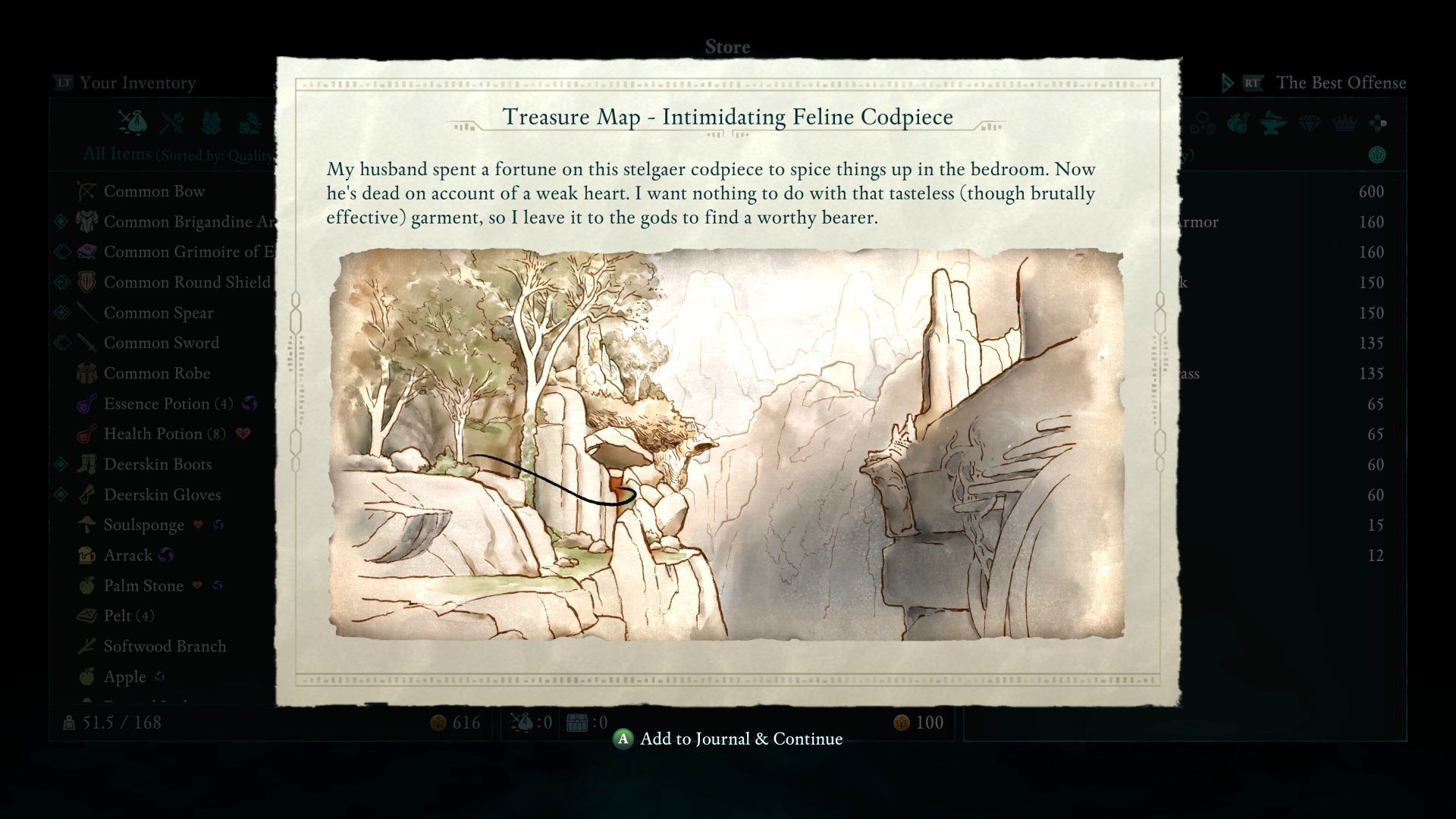 - Zakupioną mapę skarbów możecie w dowolnym momencie obejrzeć w inwentarzu. Z rysunku dowiecie się, że musicie znaleźć sekretną lokację obok klifu.