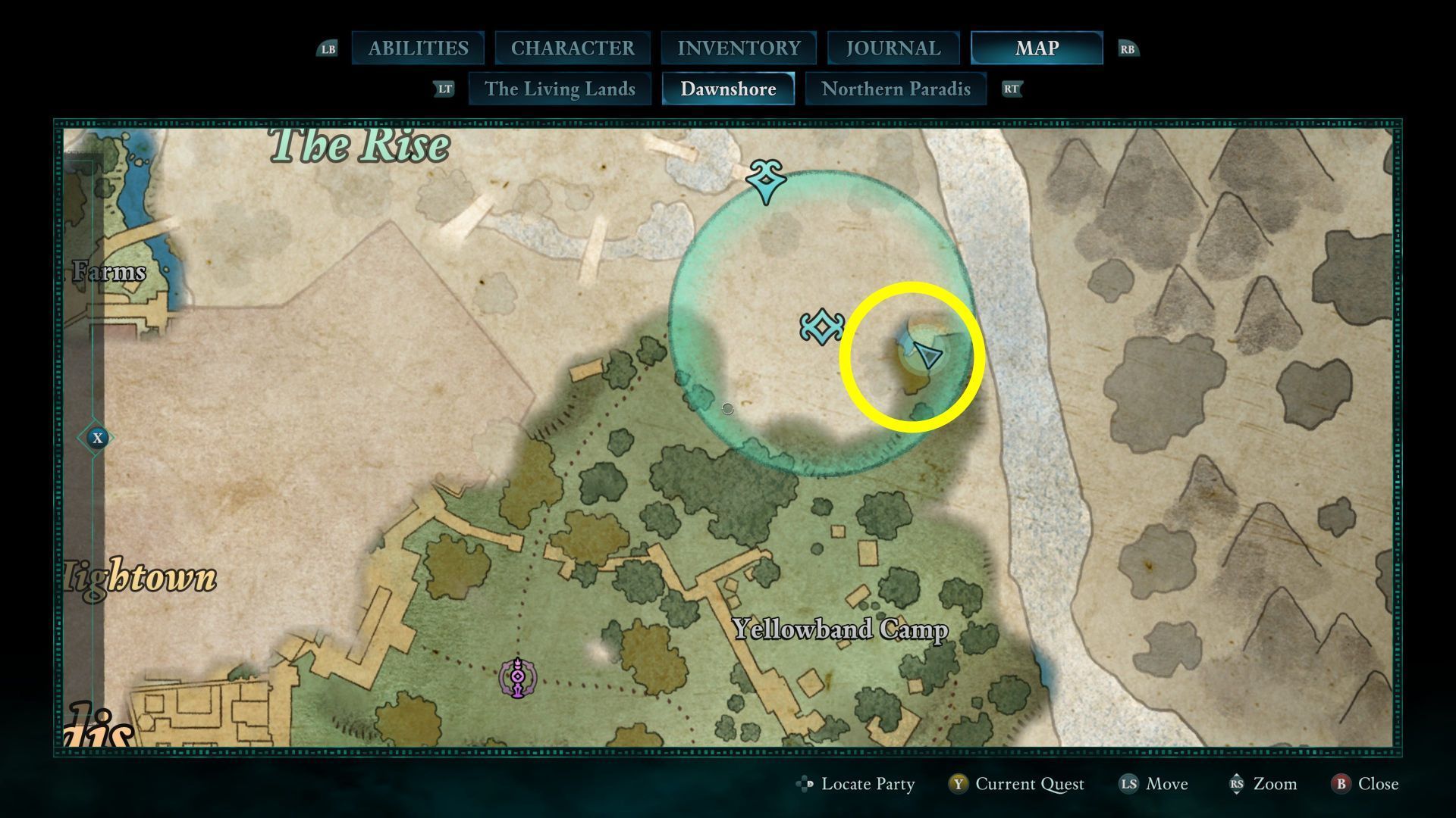 - Wyruszcie do wschodniej części regionu, do obszaru na północny-wschód od Obozu Żółtych Opasek. Jest tu ścieżka biegnąca przy klifie i miejsce to pokazują dołączone obrazki.