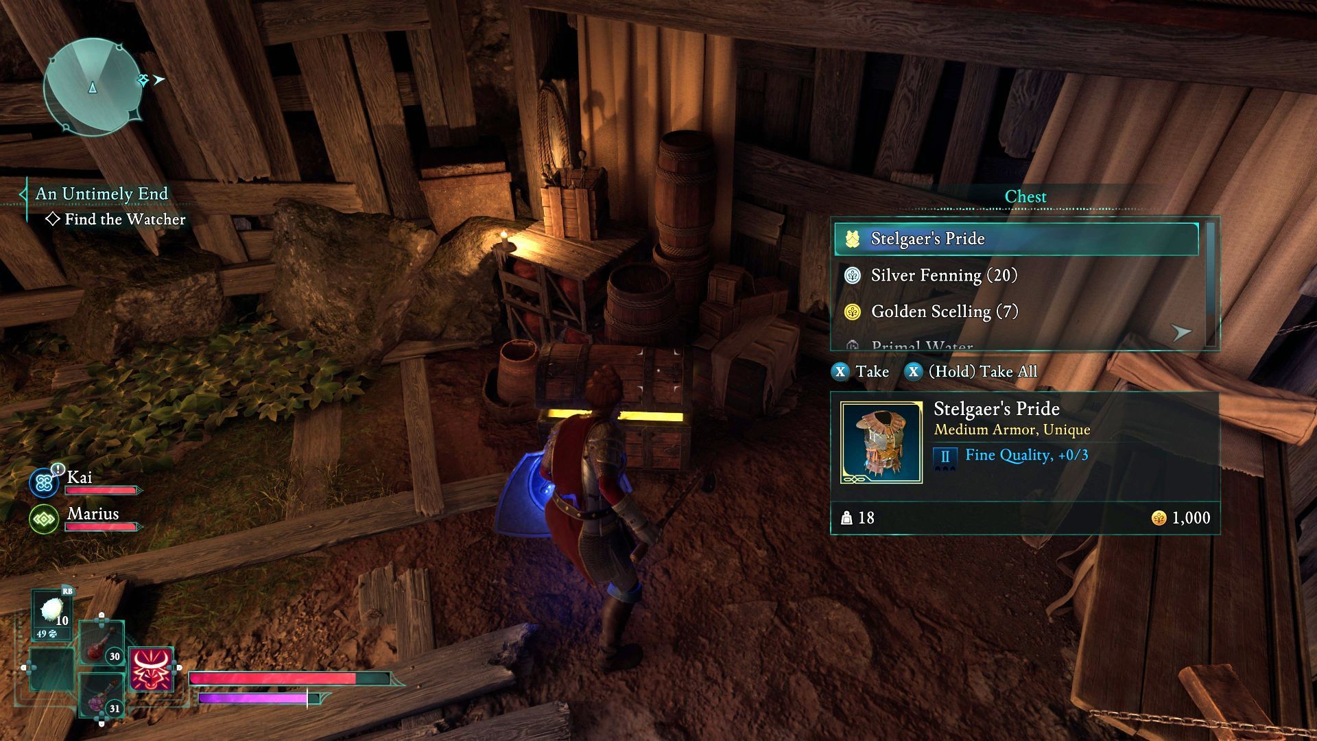 - Za deskami jest skrzynia z lootem z obrazka. Najcenniejsze znalezisko to unikalny średni pancerz Duma Stelgaera. Oprócz tego znajdziecie złoto i materiały do craftingu.
