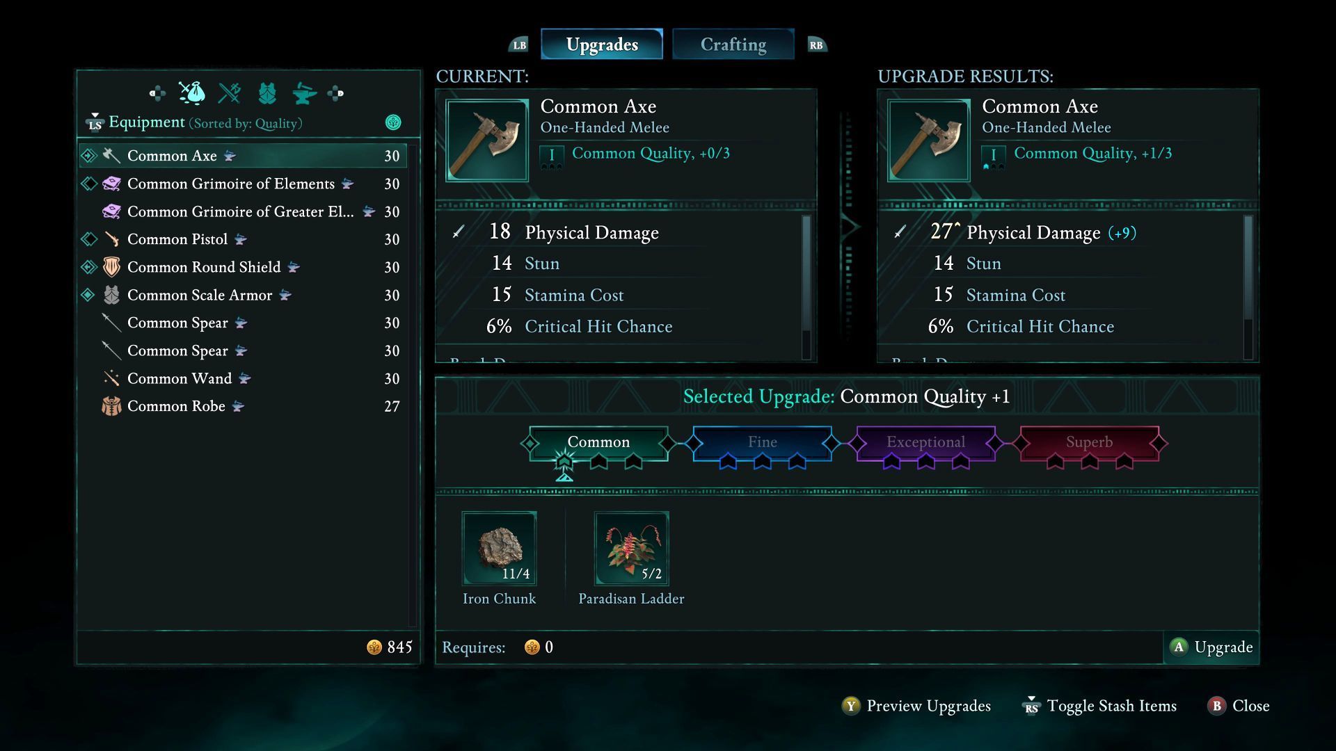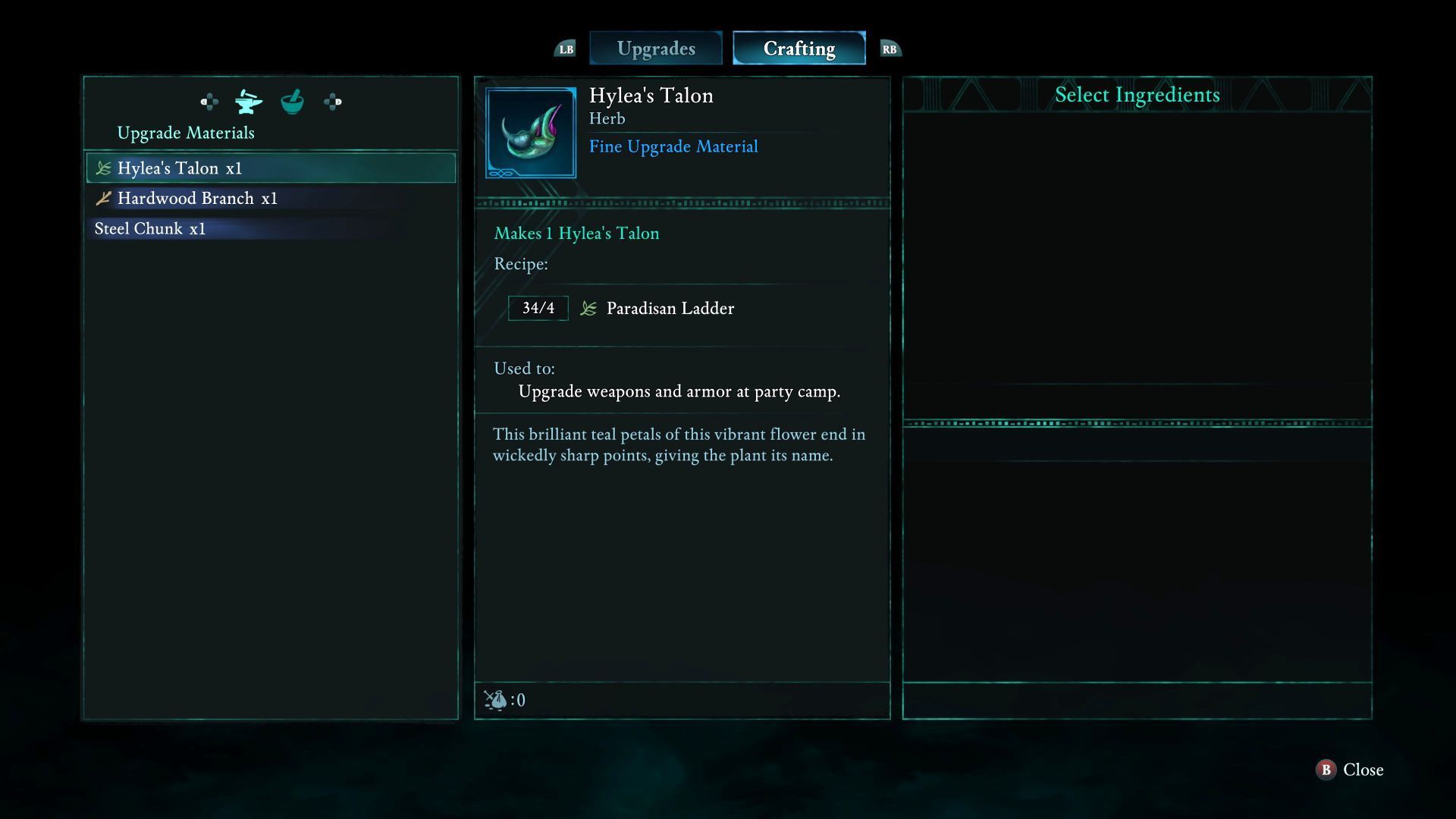 - Rajskie pnącze pojawia się na liście składników do ulepszania przedmiotów. W przykładzie z obrazka potrzebne są jego 2 sztuki do ulepszenia topora.