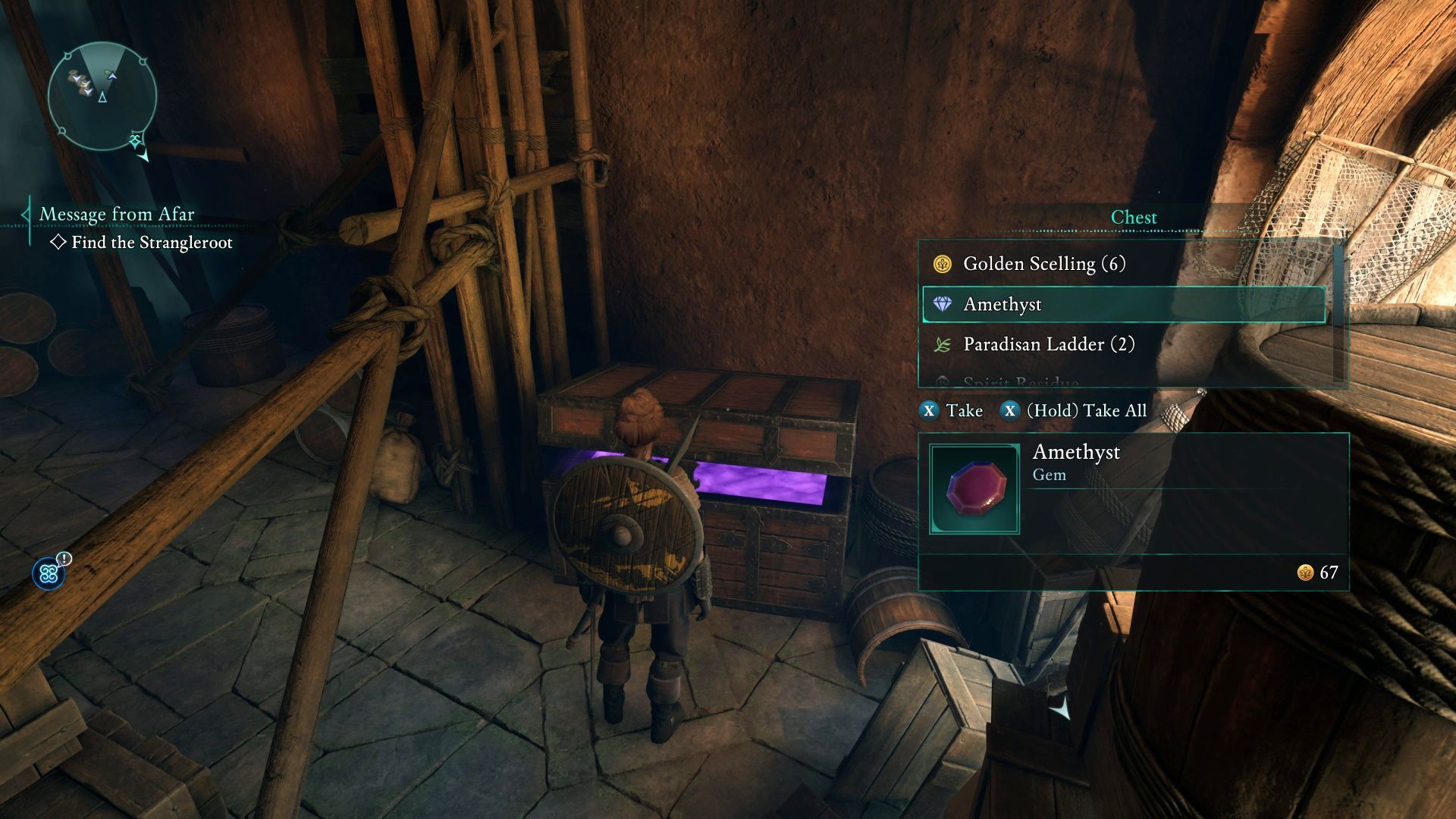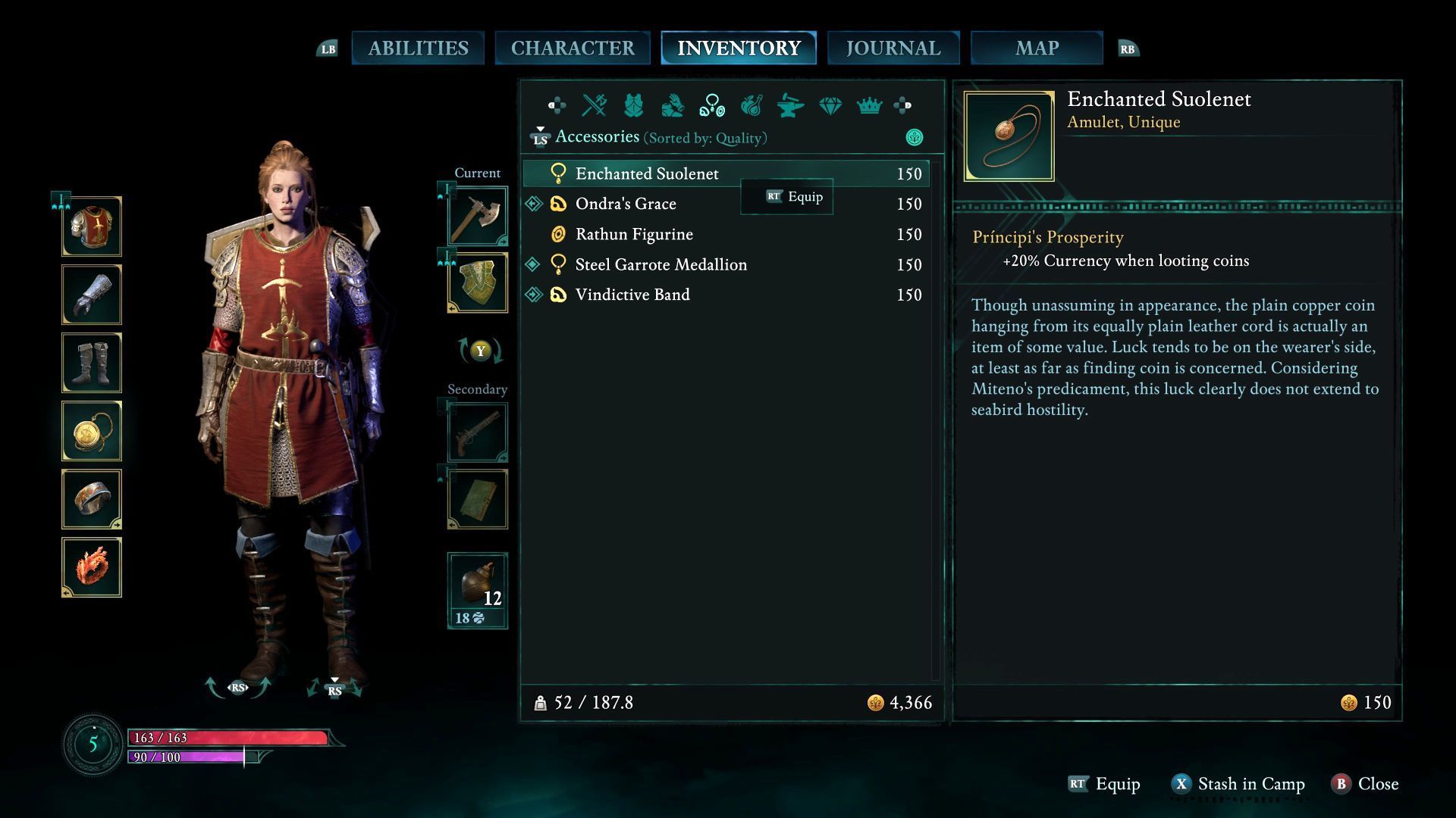 - W gromadzeniu złota mogą Wam pomagać niektóre elementy wyposażenia. Unikalny amulet w przykładzie z obrazka pozwala zbierać więcej złota z tych samych czynności. Szukajcie takich przedmiotów i zakładajcie je, by stawały się aktywne.