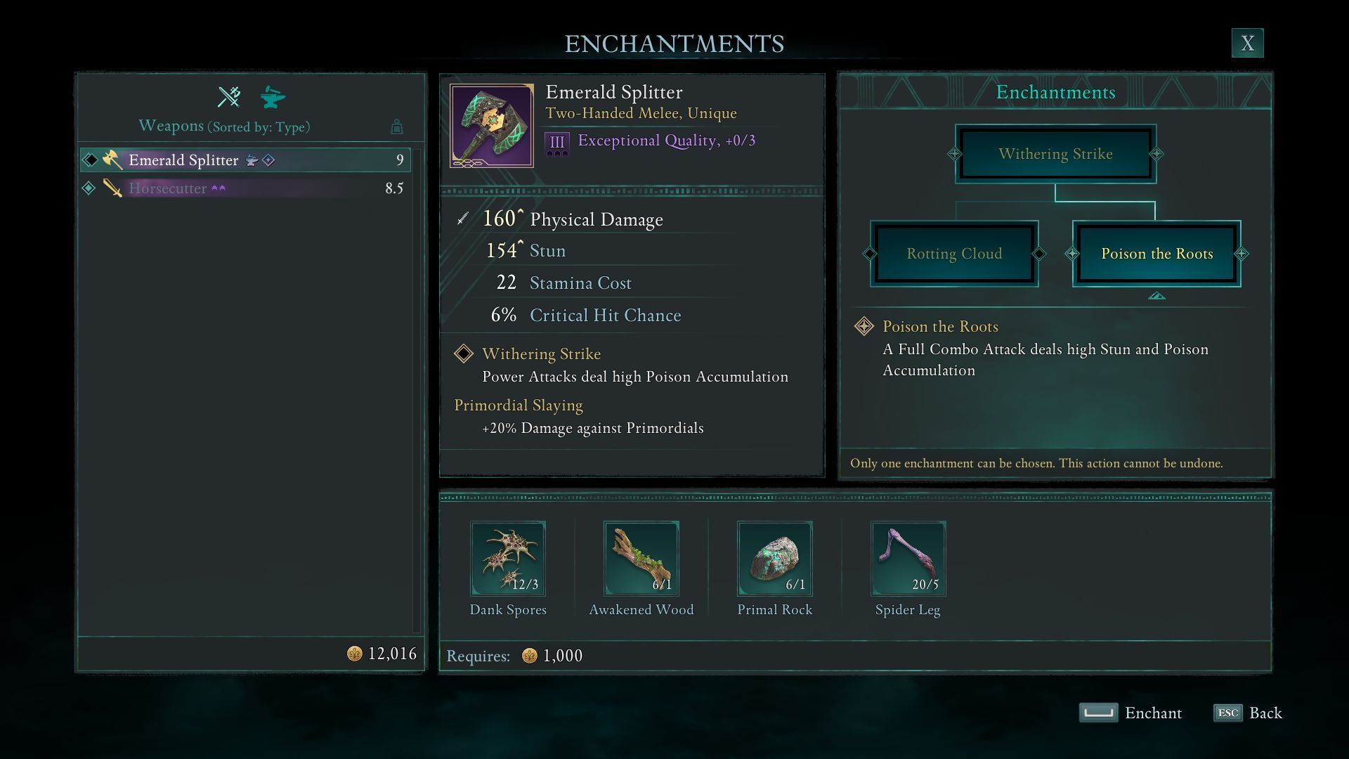 W przypadku zaklinania broni, każdy unikalny oręż posiada jeden z dwóch możliwych wzmocnień, które odblokujecie przy stanowisku do zaklinania. Wchodząc z nim w interakcję, wybierzcie np. unikalny miecz, który chcecie zaklnąć, następnie nakierujcie kursor na jeden z dwóch efektów, które chcecie odblokować i kliknijcie zaklnij. Oczywiście najpierw upewnijcie się, czy macie wszystkie potrzebne materiały do wykonania tego procesu.