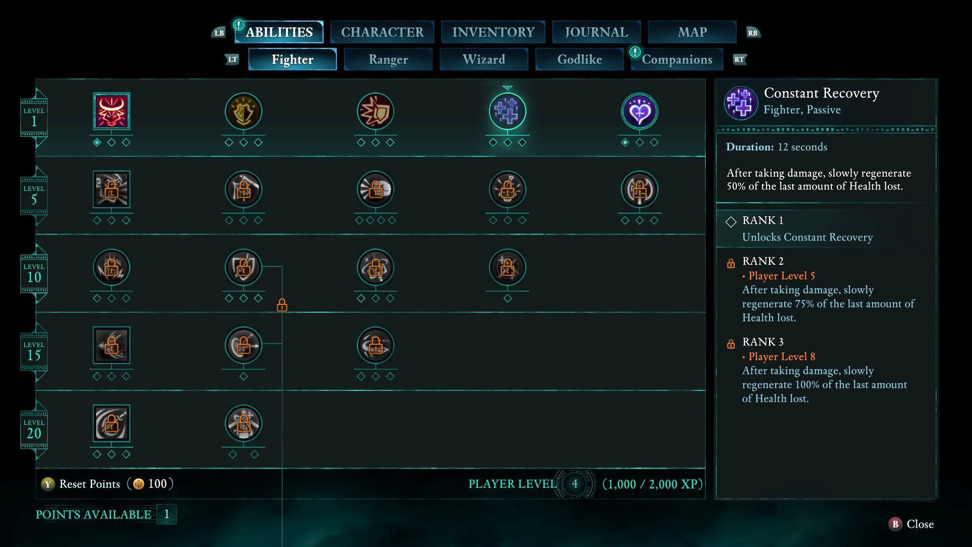 - Trwałe wytchnienie z drzewka Wojownik - Po otrzymaniu obrażeń może rozpocząć się powolna regeneracja utraconych punktów zdrowia. Na pierwszym poziomie może odnowić się tylko 50% straconych punktów, ale na najwyższym może zregenerować się 100% utraconego zdrowia.