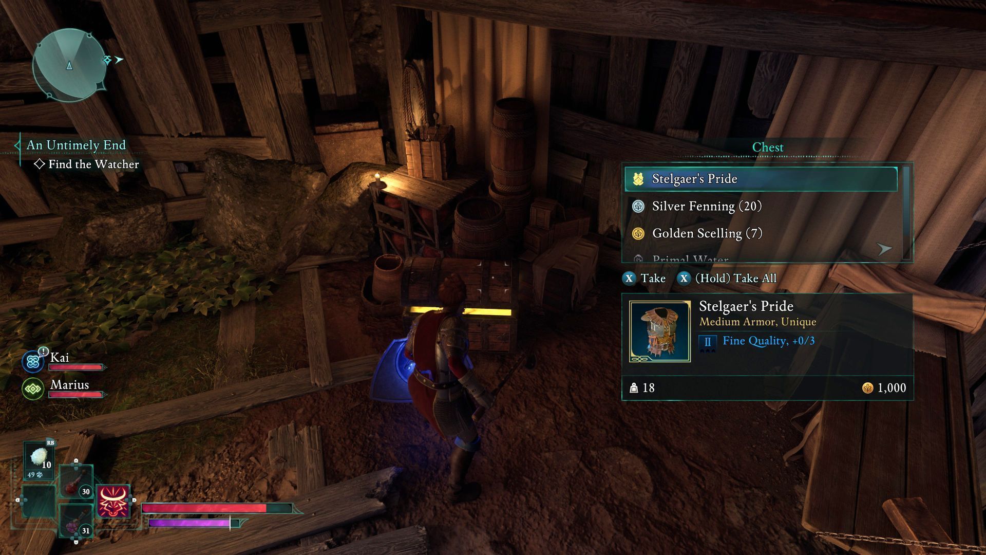 Dotrzecie do małej bariery z desek i użyjcie dowolnego ataku do jej zniszczenia. Za deskami jest skrzynia z lootem z obrazka. Najcenniejsze znalezisko to unikalny średni pancerz Duma Stelgaera.