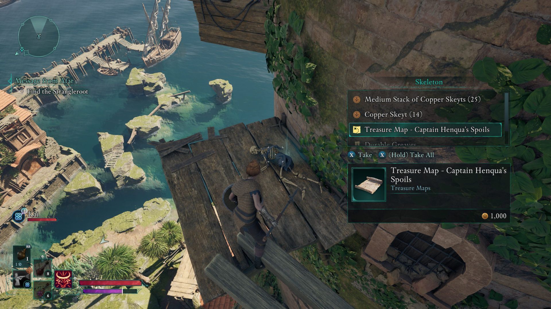 Mapę skarbów możecie znaleźć podczas wspinaczki na szczyt latarni morskiej z południowo-zachodniej części regionu. Zbadajcie szkielet pokazany na obrazku.