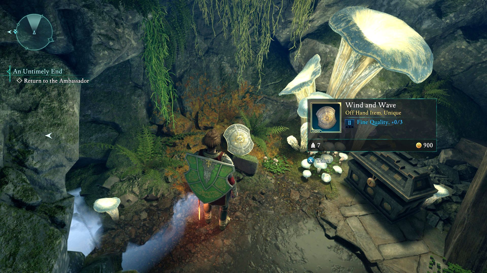 Dotrzecie do małej sekretnej jaskini. Jest w niej skrzynia z lootem, a obok niej poszukiwany skarb - unikalna tarcza Wiatr i fala.