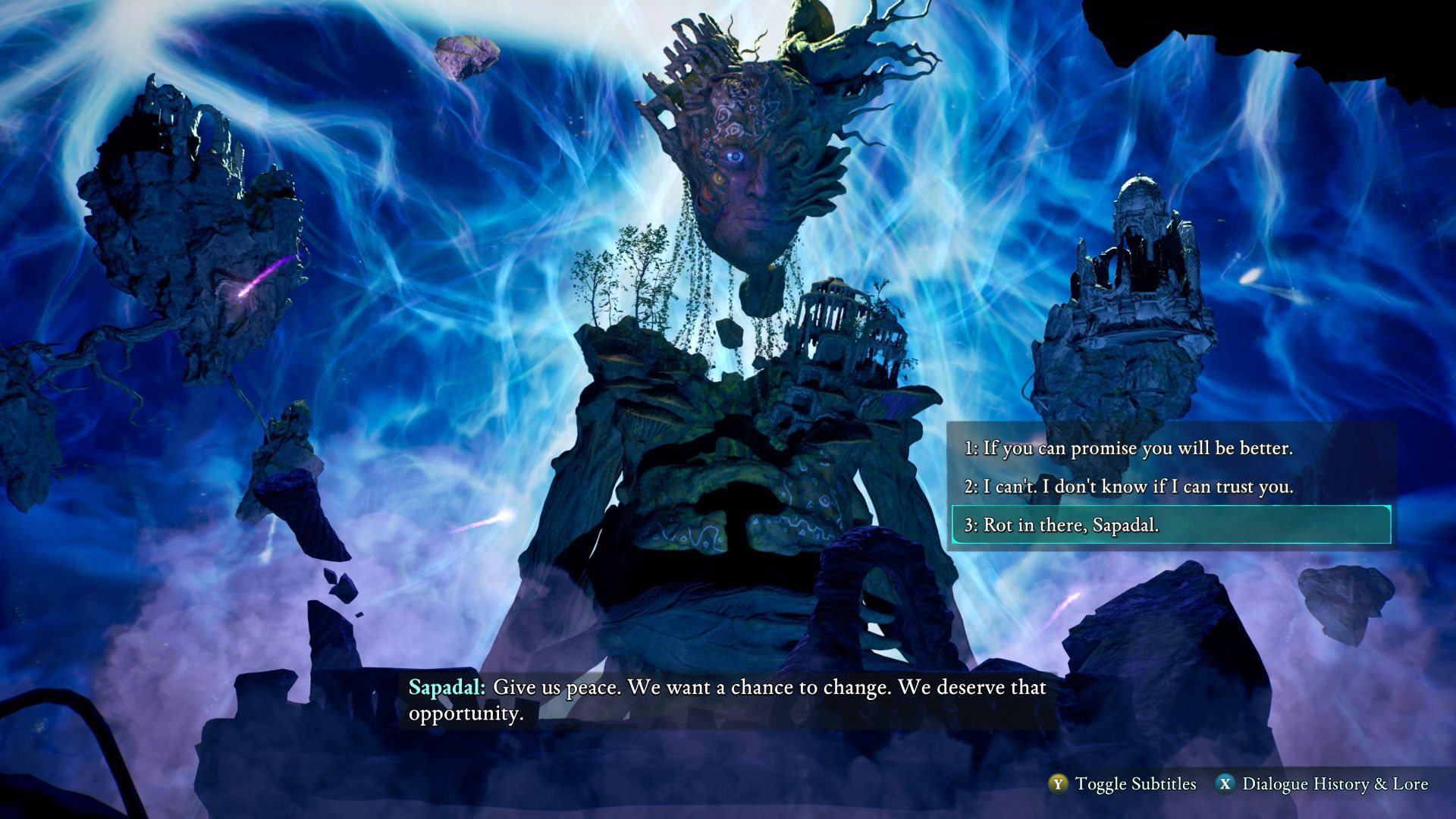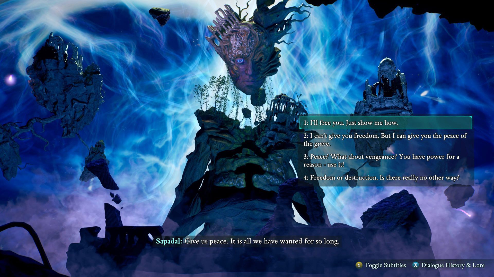 To ważny wybór podejmowany w głównym queście Serce Żyjących Ziem z lokacji Ogród. Pod koniec wizyty w tym miejscu możecie wybrać pomiędzy oswobodzeniem lub zniszczeniem Sapadala. Wybierajcie opcje dialogowe powiązane z tą pierwszą opcją.
