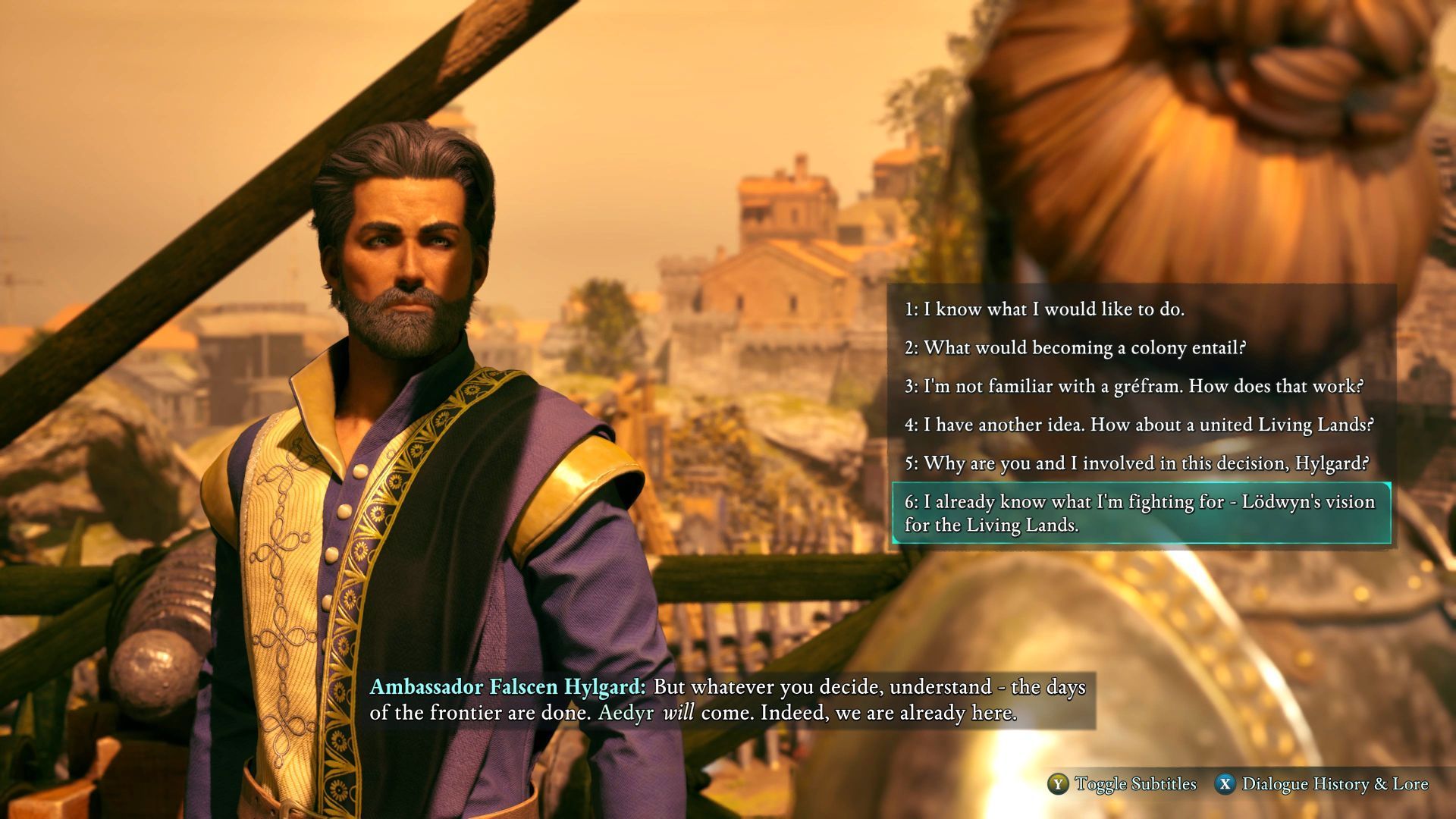 Komentarz: Osiągnięcie to można przegapić. W finałowej lokacji gry (po wizycie w Ogrodzie) rozpocznie się quest Oblężenie Rajskiego Portu i możecie spotkać się z przedstawicielami głównych frakcji. Podczas rozmowy wybierzcie ostatnią opcję dialogową z poparcia wizji Lodwyn (powyższy obrazek). Wybierajcie następnie pierwsze opcje dialogowe. Powinno dojść do odłączenia się wszystkich 4 towarzyszy od głównego bohatera.