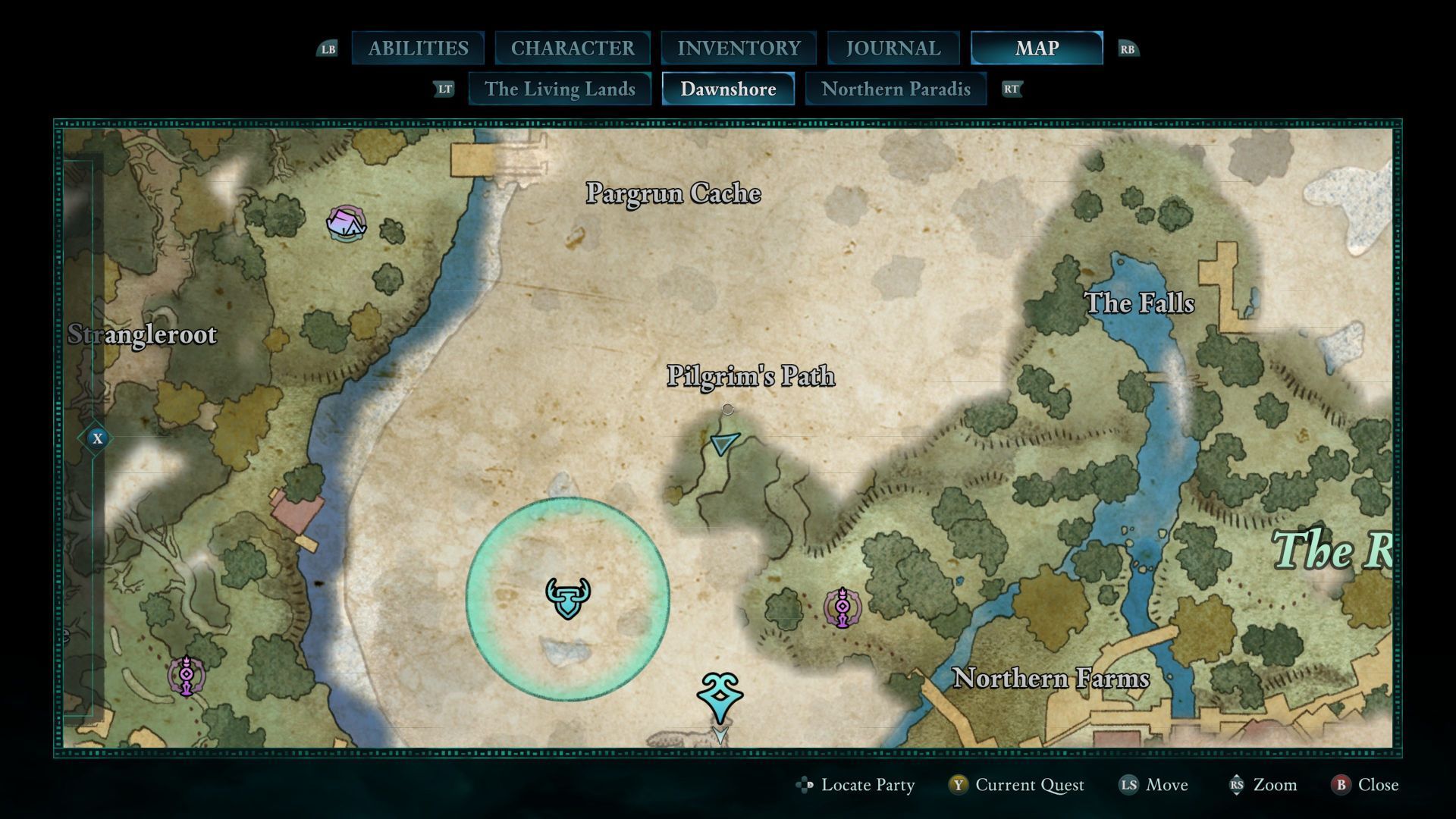 Komentarz: Skrytki Pargrunów to opcjonalne lokacje, które możecie odnajdywać w trakcie eksploracji głównych regionów świata gry. Do znalezienia jest 5 takich miejsc - 1 skrytka w Świtobrzegu, 2 w Szmaragdowych Tarasach, 1 w Pękniętej Skarpie i 1 w Kłach Galawaina. Ułatwieniem jest to, że nazwa skrytki pojawia się na mapie po dostatecznym zbliżeniu się do każdej z nich (przykład na obrazku dla regionu Świtobrzeg).