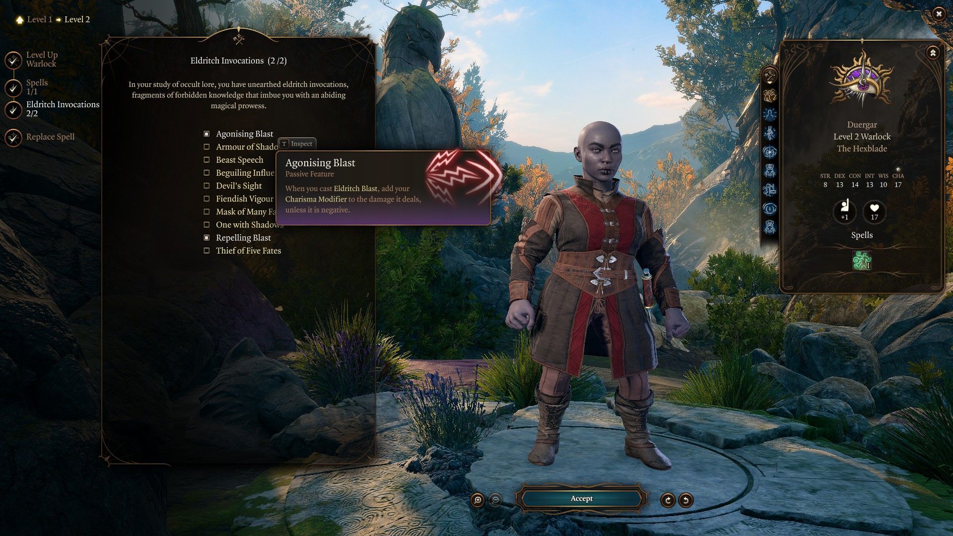 - Charyzma jest zdecydowanie najważniejszą statystyką dla cieniostrza i powinniście ją priorytetyzować, wpływa bowiem ona zarówno na wasze ataki wręcz jak i na zaklęcia. Zadbajcie także o wysoką Kondycję i umieśćcie 14 punktów w Zręczności (nie potrzebujecie więcej - 14 Zręczności wystarczy by zmaksymalizować KP zdobyte ze średniego pancerza).