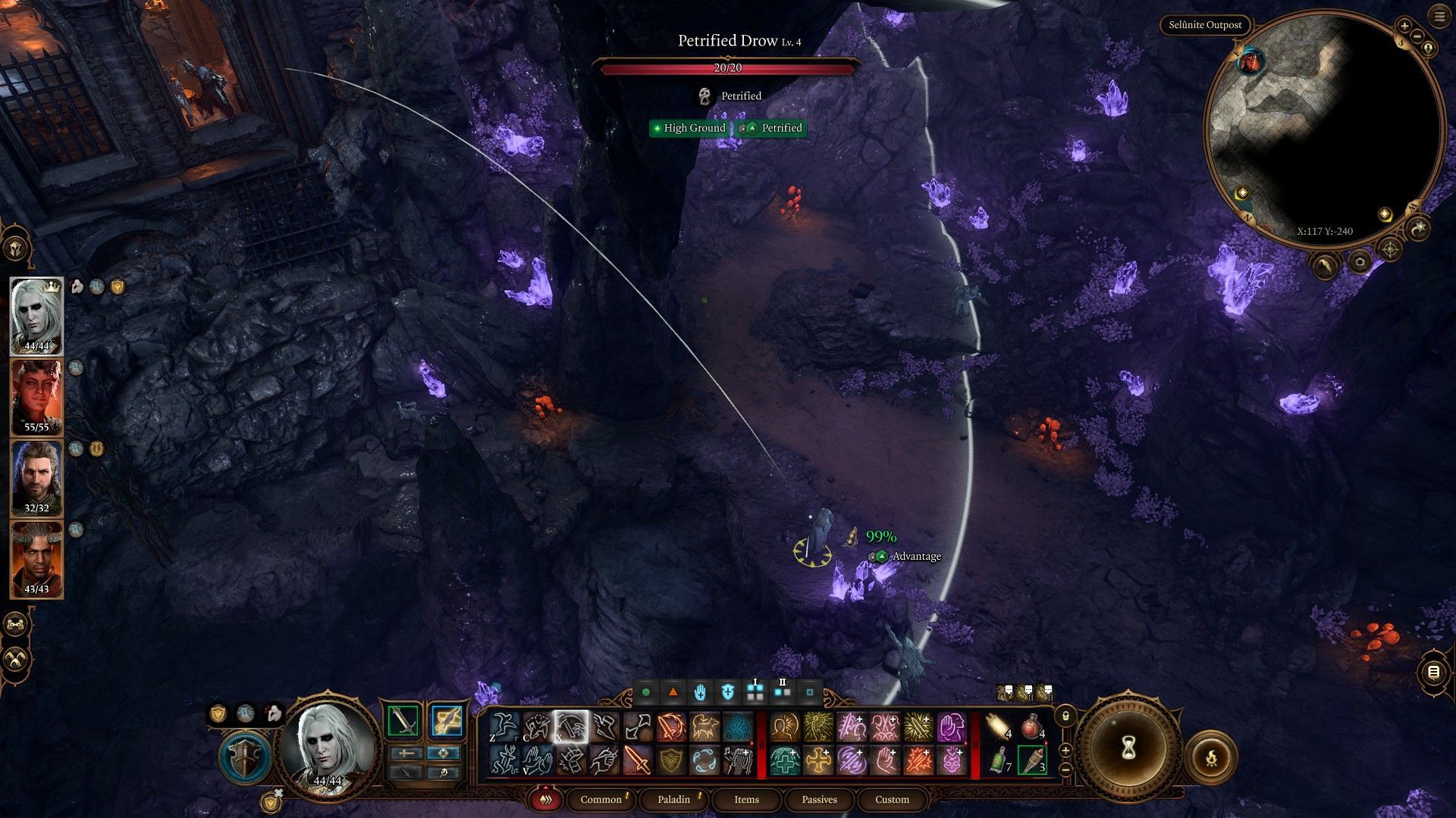 Ponadto jeden ze spetryfikowanych drowów - Dhourn - ma przy sobie fragment Żałobnego Szronu, bardzo rzadkiego kostura wzmacniającego zaklęcia zadające obrażenia od mrozu. Możecie rozpoznać go po broni - Dhourn jako jedyny z drowów trzyma sztylet zamiast łuku albo kuszy (wciśnijcie T na klawiaturze by szczegółowo go zbadać). Jeśli Dhourn zginął w walce, możecie zabrać łupy z jego zwłok. Jeśli przeżył, musicie ukraść mu fragment kostura lub go zabić - niestety nie będzie skłonny do oddania go po dobroci. Jeśli pozostał spetryfikowany, wróćcie na arenę po długim odpoczynku - pozostali przy życie drowowie odejdą, a wy będziecie mogli w spokoju pozbyć się Dhourna i zabrać jego łupy.