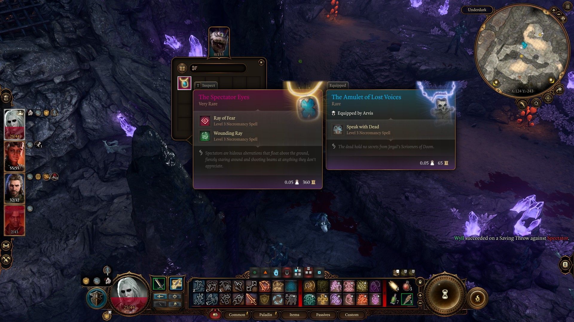 Nie lekceważcie spektatora - nakładane przez niego efekty statusu są bardzo niebezpieczne, a sama bestia zadaje gigantyczne obrażenia, zwłaszcza sparaliżowanym celom. Ponadto na poziomie taktycznym zyskuje wokół siebie aurę - jeśli dowolne stworzenie wejdzie w tę aurę, spektator natychmiast strzeli w nie losowym promieniem. Korzystajcie ze słabszych ataków by uwalniać drowy spod kontroli umysłu, po czym zasypcie spektatora swoimi najpotężniejszymi atakami i zaklęciami. Boss ma stosunkowo niską klasę pancerza i łatwo go trafić, więc szybko zginie przy skoncentrowanym natarciu.
