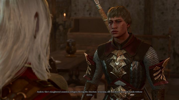 Zdecydowanie największym zagrożeniem na polu bitwy jest Anders. Potrafi atakować dwa razy na turę oraz używać boskiego ugodzenia, zadaje więc gigantyczne obrażenia. Ponadto roztacza on wokół siebie aurę ochrony, dającą mu i pobliskim wrogom +4 do wszystkich rzutów obronnych - zapomnijcie zatem o nakładaniu na niego efektów statusu. Karlach podczas szału jest jedynym członkiem drużyny mającym szansę przeżyć jego ugodzenie. Zabijcie Andersa jak najszybciej, na szczęście nie ma on przesadnie dużo zdrowia. Zwróćcie także uwagę na dywanik leżący na podłogę. Nad dywanikiem wisi prowizoryczny żyrandol - jeśli Anders stoi na dywanie lub go na niego wepchniecie, możecie strzelić lub rzucić czymś w zaczep żyrandolu by zrzucić mu go na głowę.