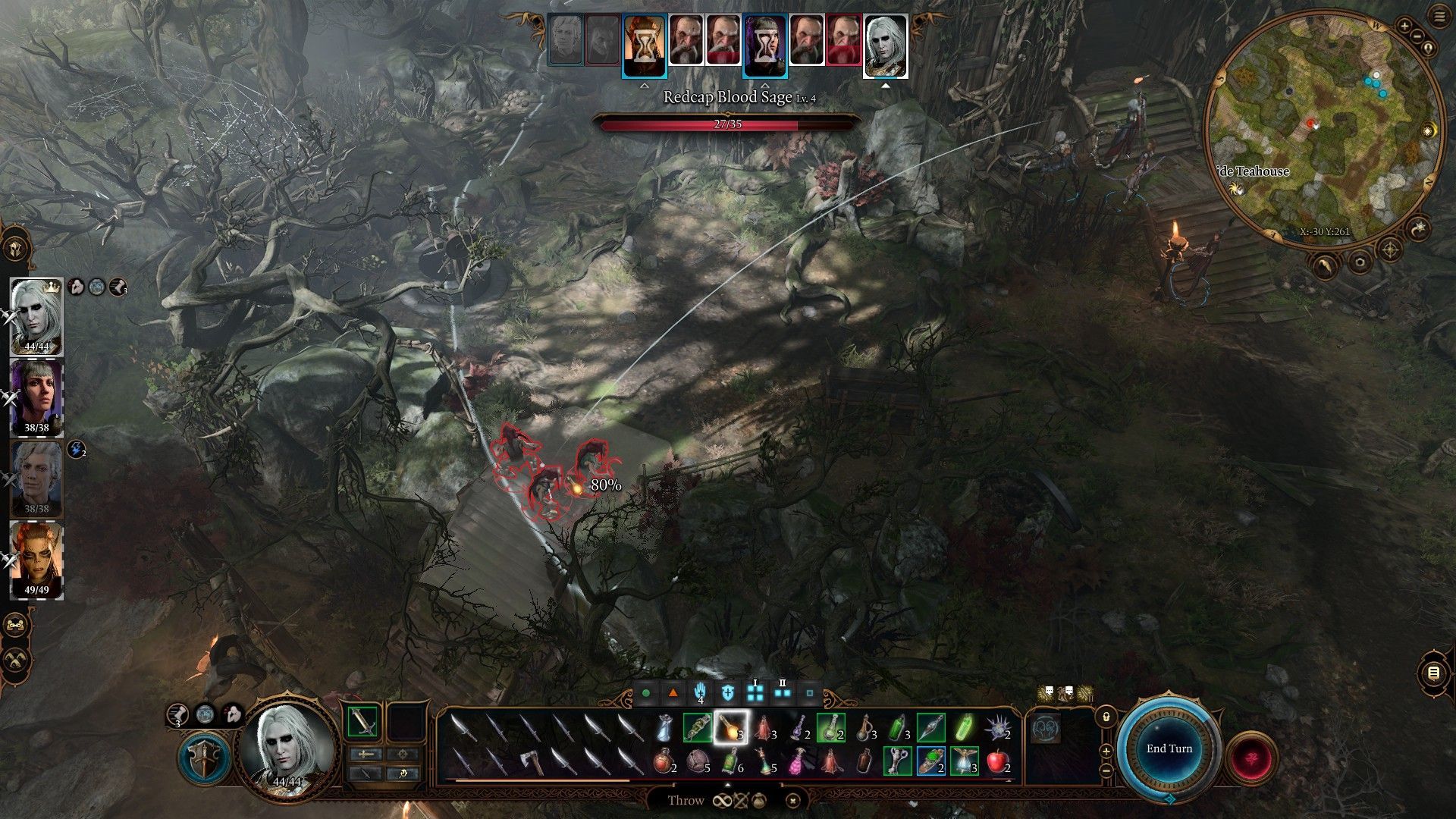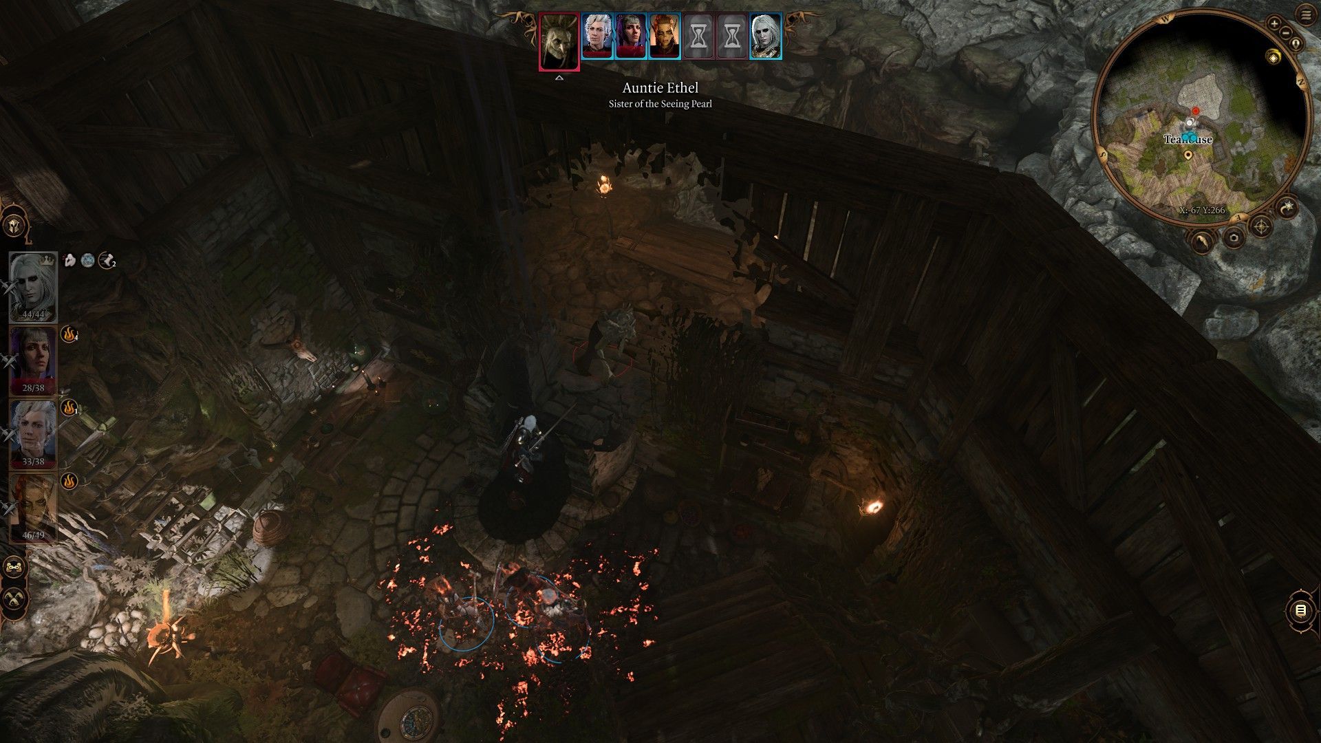 Podczas walki z krasnalami ignorujcie ciotkę Ethel - spędzi całe starcie na uciekaniu. Krasnale rozpoczynają walkę poza herbaciarnią, co pozwoli wam ostrzeliwywać ich z bezpiecznej odległości podczas pierwszej rundy. Najpierw pozbądźcie się dwóch magów krwi, którzy są mniej wytrzymali, potrafią rzucać unieruchomienie osoby oraz atakować na odległość. Bez nich pozostałe dwa krasnale mogą walczyć wyłącznie wręcz. Po walce przeszukajcie herbaciarnię, zgaście ogień w kominku i przejdźcie przez ukrytą ścianę za kominkiem by dotrzeć do zarośniętego tunelu, kryjówki Ethel.