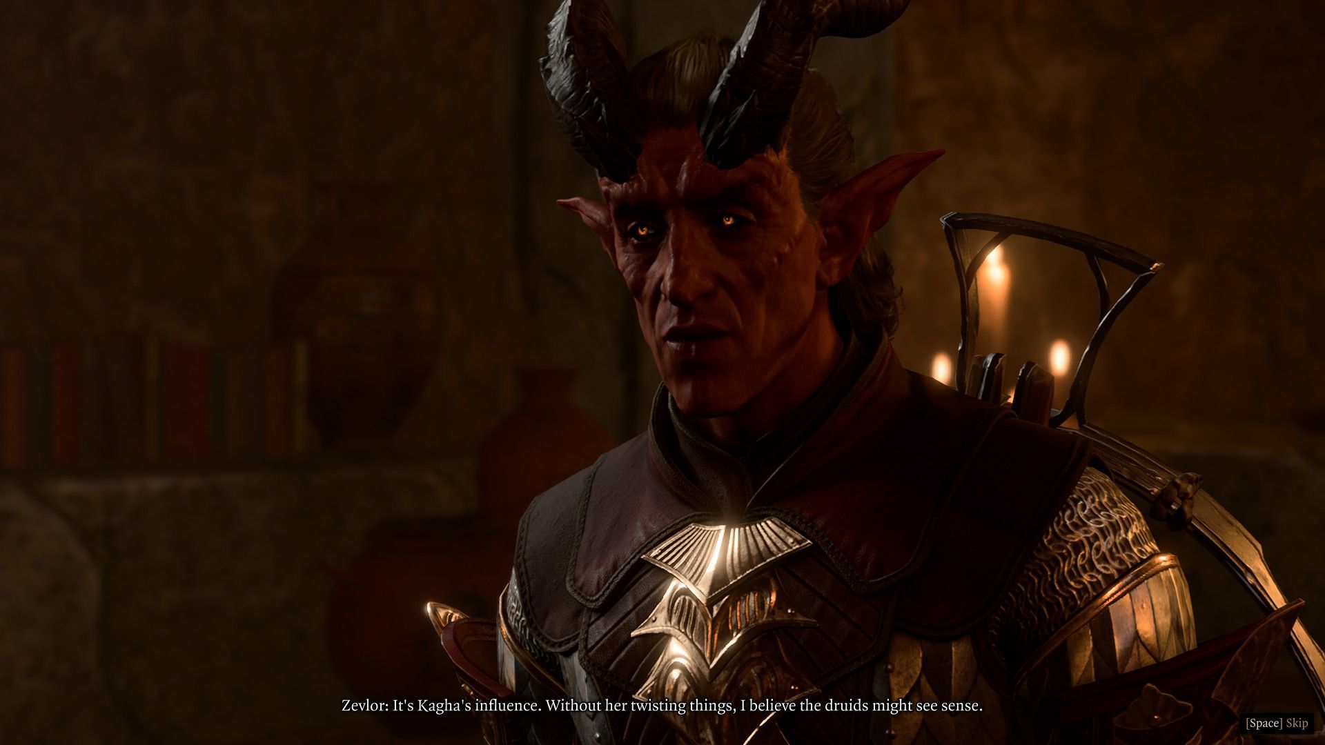 Zadanie rozpocznie się podczas rozmowy z Zevlorem, przywódcą diabląt kryjących się w gaju. Podczas waszego pierwszego spotkania z Kaghą, arcydruidka zleci wam wyrzucenie Zevlora i diabląt z gaju. Ponieważ poza gajem aż roi się od goblinów, równałoby się to pewnej śmierci. Zevlor jest tego świadomy i poprosi was o zamordowanie Kaghi, licząc na to, że jej śmierć zakończy wrogość między druidami i uchodźcami. Jeśli spróbujecie siłą wyrzucić go z gaju, zaatakuje was.