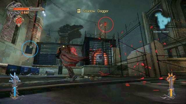 Kontynuuj wędrówkę w stronę znacznika, pokonaj wrogów, którzy pojawią się koło fontanny, a następnie znajdź słup z linią wysokiego napięcia, znajdujący się za generatorem. Rzuć w niego Sztyletem Cienia, by odciąć prąd, co pozwoli ci wdrapać się po kablach (znajdują się one tuż obok znacznika na mapie). Zanim wskoczysz do budynku, rozejrzyj się dokładnie - pod sobą znajdziesz małą alejkę, na której znajduje się kapliczka z Memoriałem - zeskocz na dół, zbierz go, a następnie wróć do miejsca, w którym wskoczyłeś na kabel (wskocz na kontener i przeskocz przez dziurę w ogrodzeniu) i przedostań się nim do budynku.